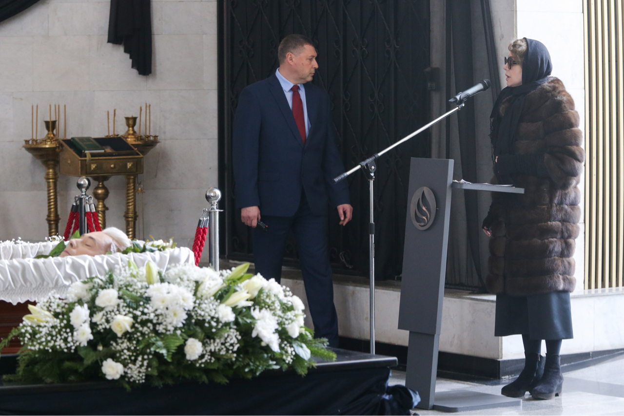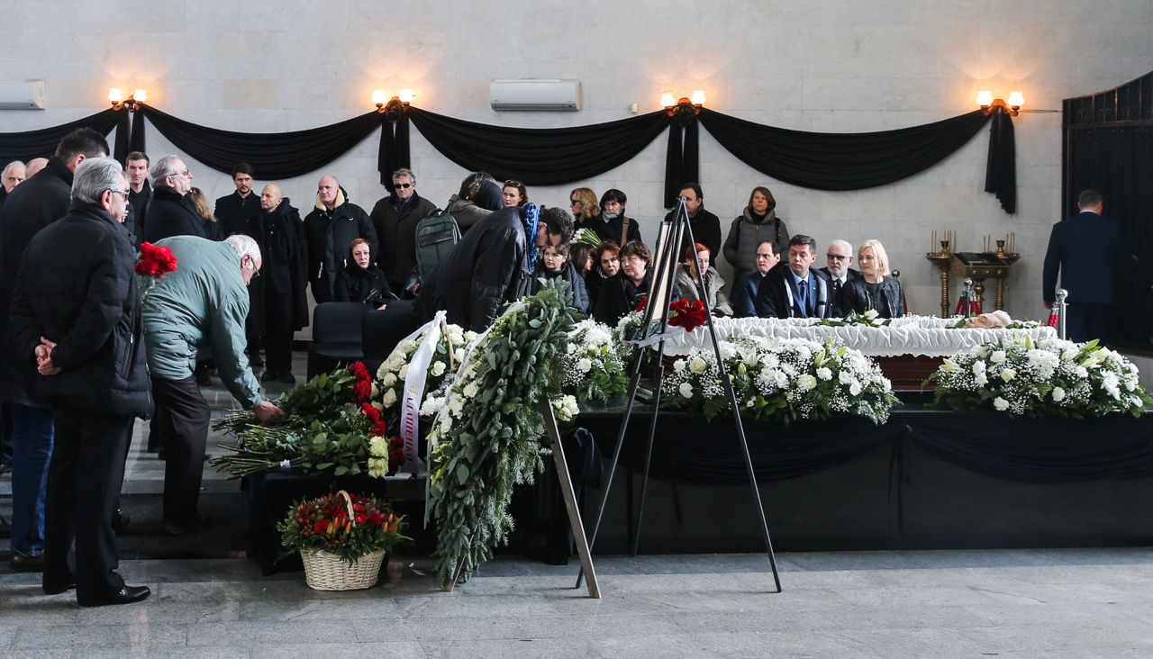 Для родственников перед гробом поставили стулья, хотя они практически не потребовались. Пришедшие не решались сесть, и даже вдова Божена Рынска, самый близкий Малашенко человек в его последние годы, все время вставала со своего места и растерянно ходила между рядов, всматриваясь в лица и обнимаясь с теми, кого узнавала. Чтобы никто не видел заплаканных глаз, она надела темные очки, несмотря на то что в помещении было совсем не светло.