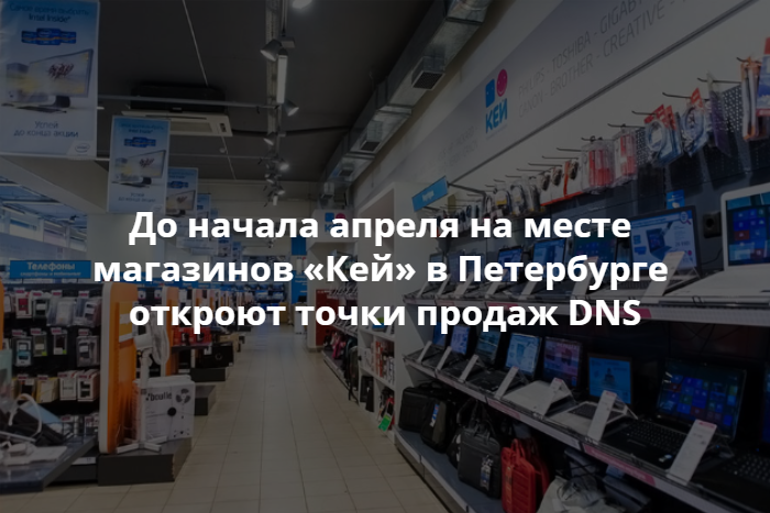 Петербургская сеть магазинов электроники «Кей» закрыла все магазины в городе. На их месте до начала апреля планируют открыть точки продаж сети DNS, сообщает «Фонтанка».