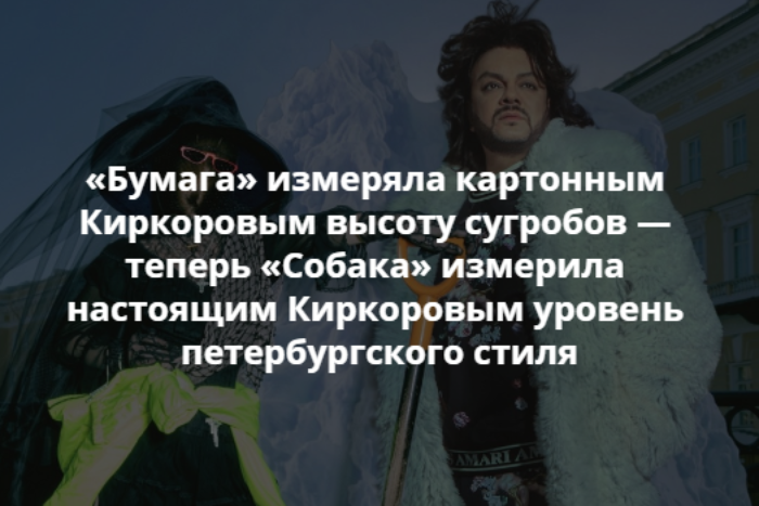 Издание «Собака.ru» выпустило фотопроект, в котором измерила настоящим Филиппом Киркоровым уровень петербургского стиля. В подводке авторы материала упоминают проект «Бумаги» по измерению куч снега в Петербурге картонным Филиппом Киркоровым.