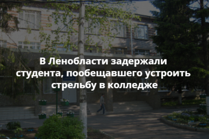 «Интерфакс» со ссылкой на источник пишет, что замдиректора Волховского колледжа транспортного строительства обратилась в правоохранительные органы накануне утром. Она сообщила, что молодой человек 2002 года рождения высказал в соцсетях намерение прийти в колледж в понедельник и устроить там стрельбу.