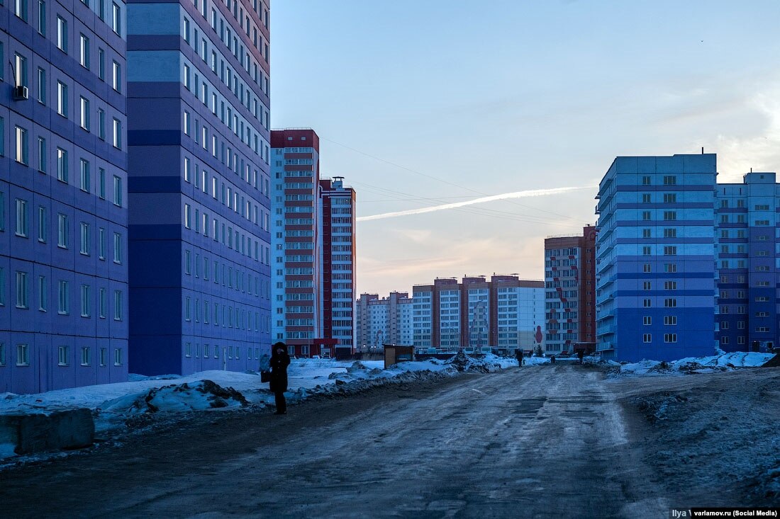 Жители нового микрорайона подтвердили редакции "Сибирь.Реалий", что "Просторный" построили в чистом поле, где до сих пор нет дорог, благоустройства и даже фонарей, в некоторых высотках нет лифта, у дверей в подъезды – ступеней, а во дворах лежит строительный мусор, присыпанный снегом.