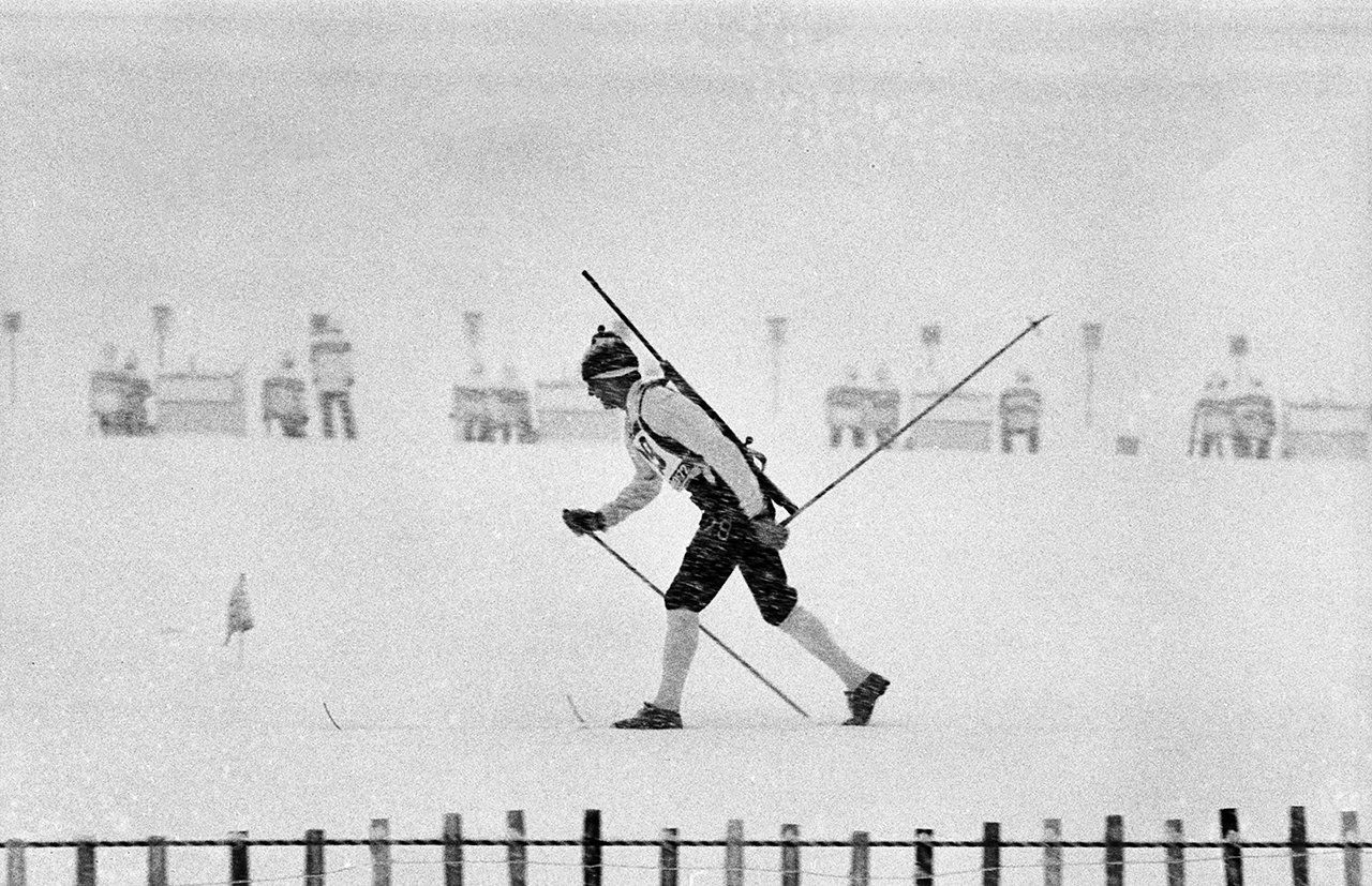 Alexander Tikhonov took the first leg of the men’s biathlon relay. Already known as one of the greatest athletes in the history of the sport, which combines cross country skiing with rifle shooting, Tikhonov would later become known as Mister Biathlon. As he began the race, Tikhonov reached his usual devilish speed, but when he arrived at the second firing range, his nerves began to get the better of him. Tikhonov missed twice, dove into a shaky sprint, and broke one of his skis. At first, he continued the race on one leg until a biathlete from the East German team extended one of his own skis to Tikhonov, perhaps in the name of socialist brotherhood. The Soviet star managed to ski for one more kilometer, at which point he finally received an emergency pair of skis. Tikhonov finished his leg of the relay last, but his teammate Rinat Safin ultimately caught up with all of his competitors, and team USSR skied its way to a gold medal despite it all.