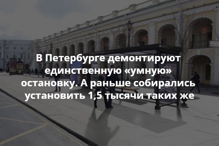 В Петербурге к чемпионату мира по футболу планировали открыть не меньше 50 «умных» остановок — с информационным табло, видеокамерами, бесплатным Wi-Fi и станциями для подзарядки телефонов. К 2020-му в городе собирались установить 1,5 тысячи таких павильонов, но за два года установили лишь один у Гостиного двора. В марте его начали демонтировать.