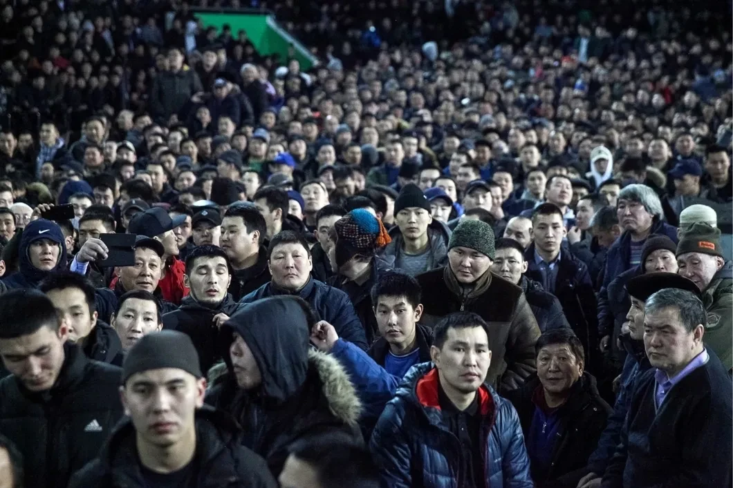 На следующий день на арене «Триумфа» к многотысячному собранию обращается Айсен Николаев, глава республики. Говорит по-якутски. Воспользуюсь переводом Sakhalife.ru (он кажется точным, если сверять смыслы послания с теми, что глава Якутии сам выложил на русском языке в соцсетях).
