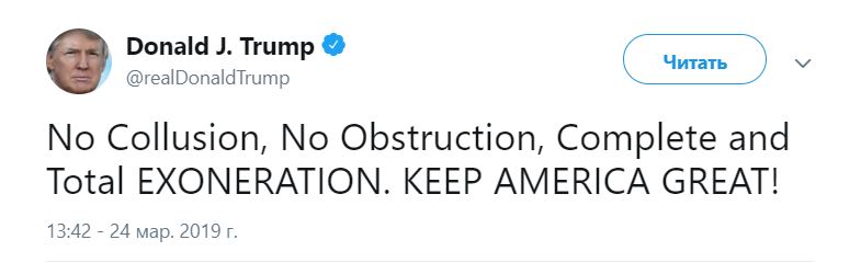 - Сам Трамп, молчавший в твиттере двое суток после новости о завершении расследования, счастлив: «Не было сговора, не было воспрепятствования правосудию, полное и абсолютное ОПРАВДАНИЕ!»