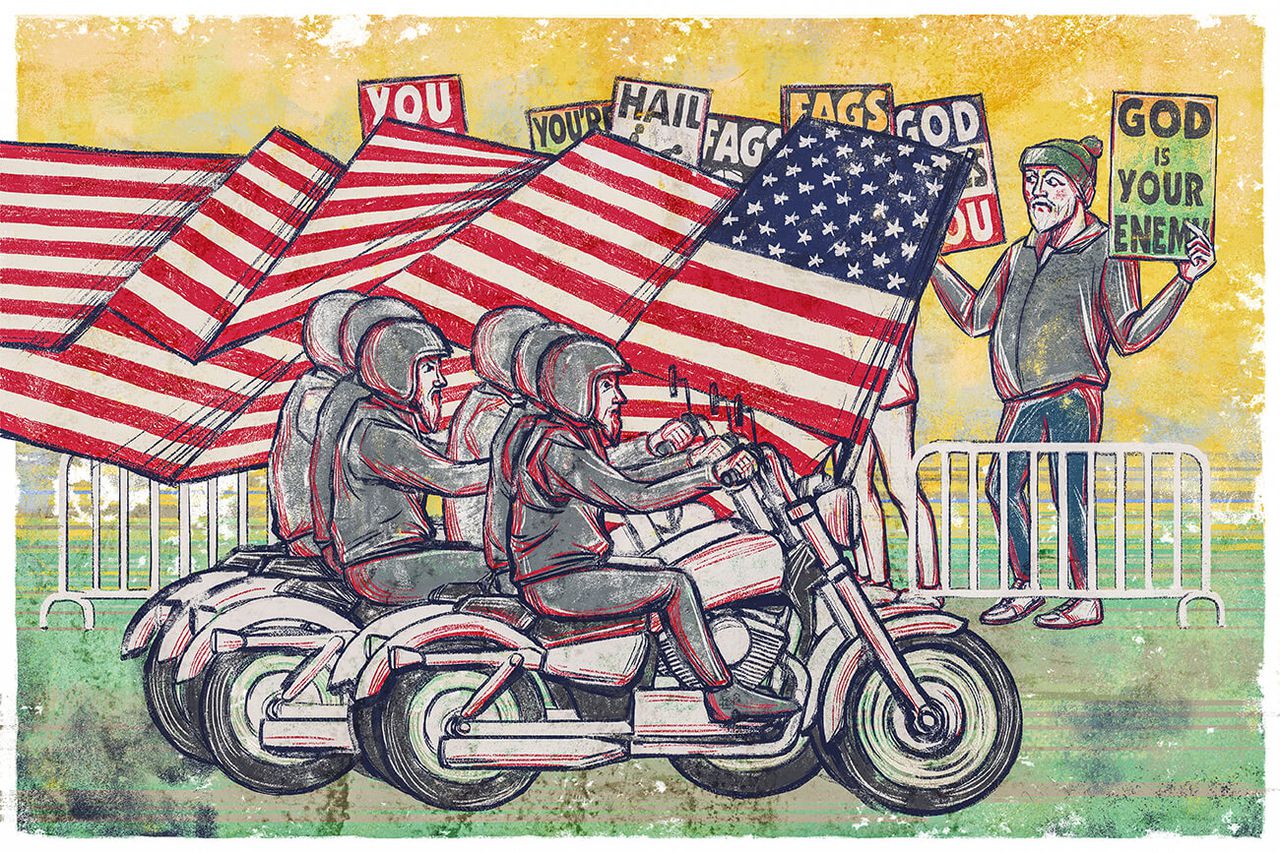 К армии в США относятся с пиететом: погибшие в войне считаются героями, их семьи пользуются всеобщим уважением. В 2005 году, когда страна вела две войны, которые рассматривались как справедливое возмездие за теракты, это было правдой вдвойне. Именно тогда Фелпсу впервые пришла в голову идея устроить протест на панихиде военнослужащего — рядовой Кэрри Френч, убитой в Ираке в результате взрыва кустарной мины. Эта акция потрясла американское общество, в одночасье сделав общину Фелпса самой ненавидимой в стране. В дальнейшем такие пикеты стали регулярными.