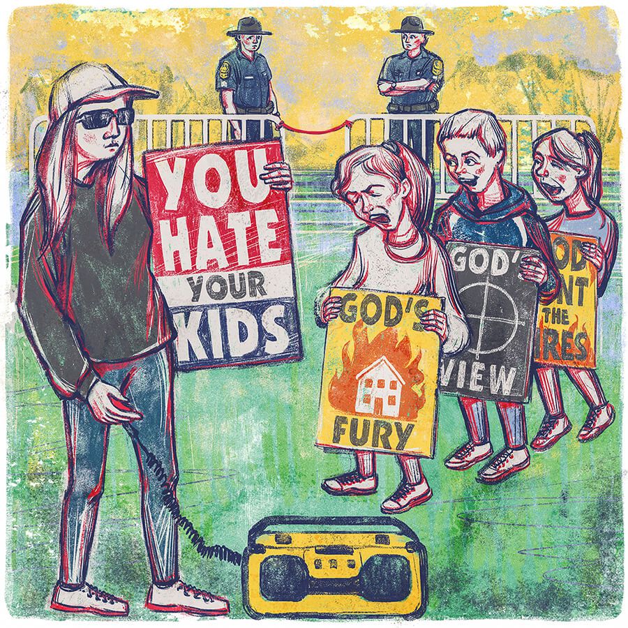 Меган Фелпс-Ропер, одной из участниц протеста, тогда было восемнадцать. Она стояла там вместе со своей семьей, единственной, которая у неё была: общиной Баптистской церкви Вестборо. Через двенадцать лет на подкасте у Джо Рогана она вспоминала эту демонстрацию как самую экстремальную из сотен подобных, в которых ей довелось принять участие. Она помнит, как кто-то прыгнул на неё из толпы, пытаясь отнять плакат. Как её кузен, испугавшись, что противостояние может обернуться насилием, взобрался на мусорный бак и стал кричать, выдавая себя за участника парада: «Хорош, ребята, не обращайте на них внимания, они того не стоят!» Но больше всего в тот момент её возмутила реакция полицейских: вначале они просто стояли, не обращая внимания на потасовку, а когда её семилетний брат, испуганный напором толпы, попытался убежать и перебрался через ограждение, один из полицейских достал дубинку и заставил его перелезть обратно.