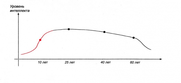 На схеме показано развитие интеллекта: по экспоненте – до 8-10 лет, далее стабилизация – до 20-22 лет, затем ровный участок с небольшим спадом после 40 и ускоренное замедление. Если представить нашу цивилизацию как отдельного человека, то мы сейчас в точке «8-10 лет». До 60 еще далеко, но спад неизбежен, если нашими «конкурентами» в этом периоде окажутся умные машины, их превосходство будет очевидно.