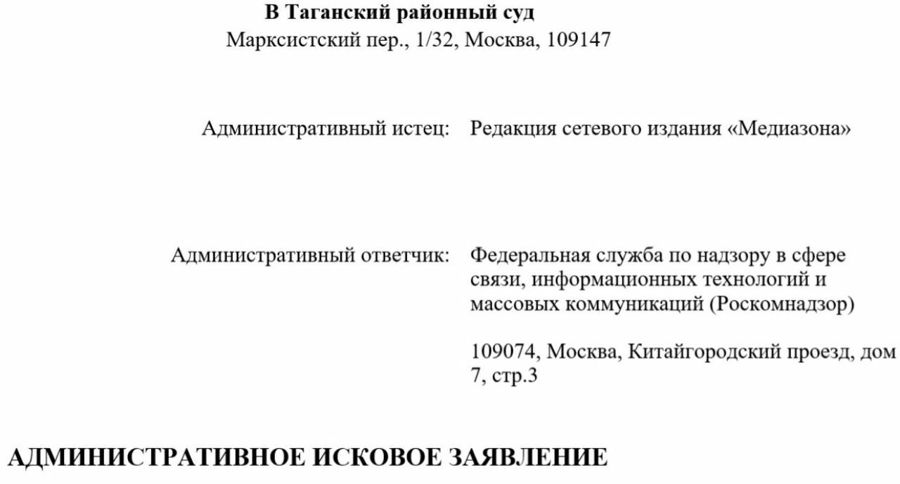 Редакция просит признать решение Федеральной службы по надзору в сфере связи, информационных технологий и массовых коммуникаций незаконным. Об этом сегодня, 28 марта 2019 года, сообщает представитель издания, юрист Севан Авалян, сотрудничающий с «Агорой».