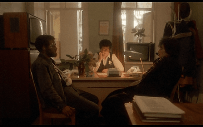 И тут вдруг приходят два героя, такие не соответствующие всей эстетике кабинета администраторши, вышедшие из абсолютно другого мира: избитые, мятые, один настоящий кореец, второй фальшивый африканец (простим это Соловьёву: он хотел как лучше). Они не соглашаются и не спорят, а просто встают и уходят и делают то, что хотят. В этом молчаливом уходе для меня закодировано больше «перемен», чем в следующей легендарной сцене и песне.