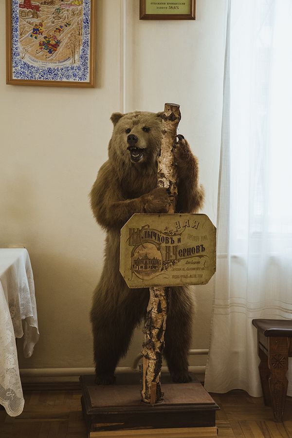Экспонат, который мог бы стать символом Талдомского музея и его истории, — это чучело медведя из краеведческого зала. В 1900-е годы этого медведя купил местный купец для своего ресторана в центре Талдома, где зверь стоял на входе с подносом в руках. После национализации ресторана медведя отправили в музей, где его решили вернуть в живую природу, для чего пришлось немного переделать ему передние лапы. Из них изъяли поднос и выдали медведю ствол берёзки. Сегодня медведь всё ещё обнимает берёзку, но уже в привычном контексте — в экспозиции, посвящённой трактиру и общественной жизни Талдома.