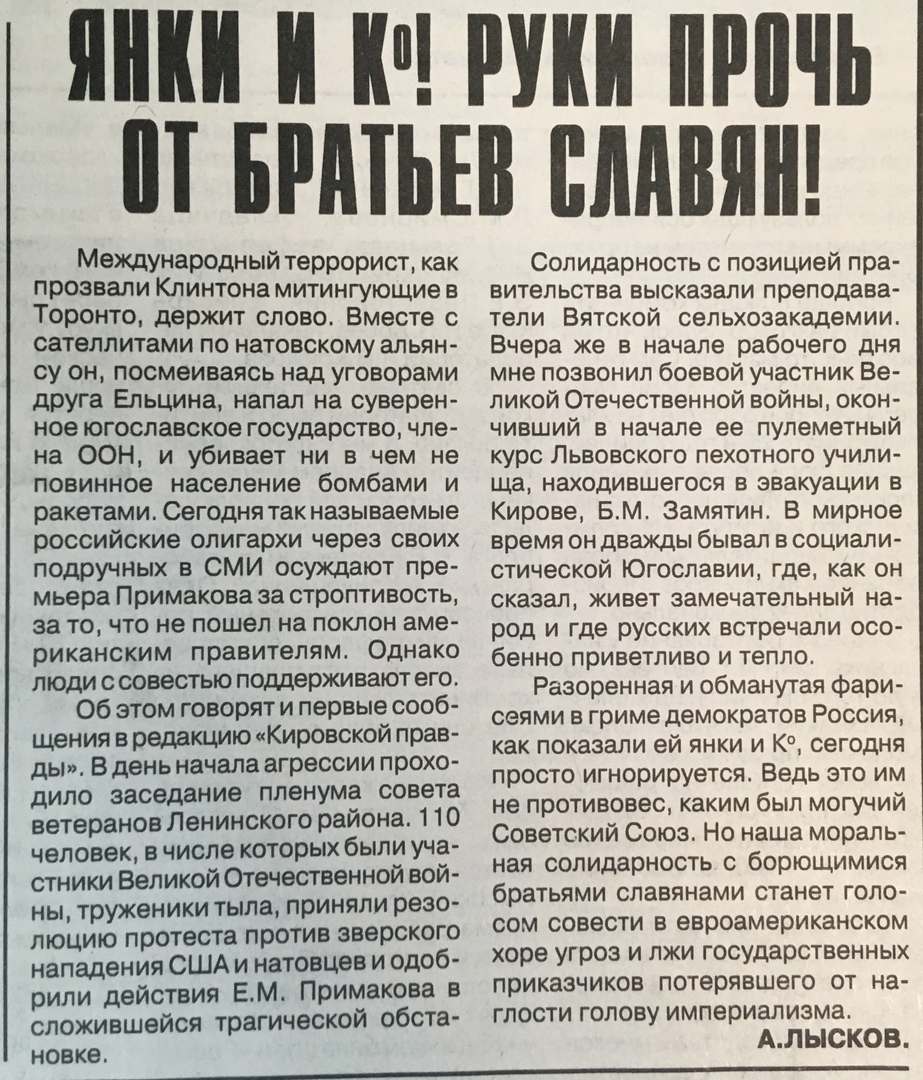 Главное событие марта – атака войск НАТО на Югославию. 24 марта 1999 г. генеральный секретарь НАТО Хавьер Солана отдал приказ командующему силами НАТО в Европе американскому генералу Уэсли Кларку начать военную операцию против Югославии. Вечером того же дня Белград, Приштина, Ужице, Нови-Сад, Крагуевац, Панчево, Подгорица и другие города подверглись ударам с воздуха. Президент России Борис Ельцин выступил с обращением к миру, в котором попросил Клинтона не делать этого трагического, драматического шага. Премьер-министр Евгений Примаков, направлявшийся с визитом в США, развернул самолёт над Атлантикой и экстренно вернулся в Россию. Эти события активно освещала кировская пресса. 26 марта газета «Кировская правда» вышла с передовицей «Натовские ястребы бомбят Югославию». Особенно яркой и эмоциональной получилась статья «Янки и Ко! Руки прочь от братьев славян!».