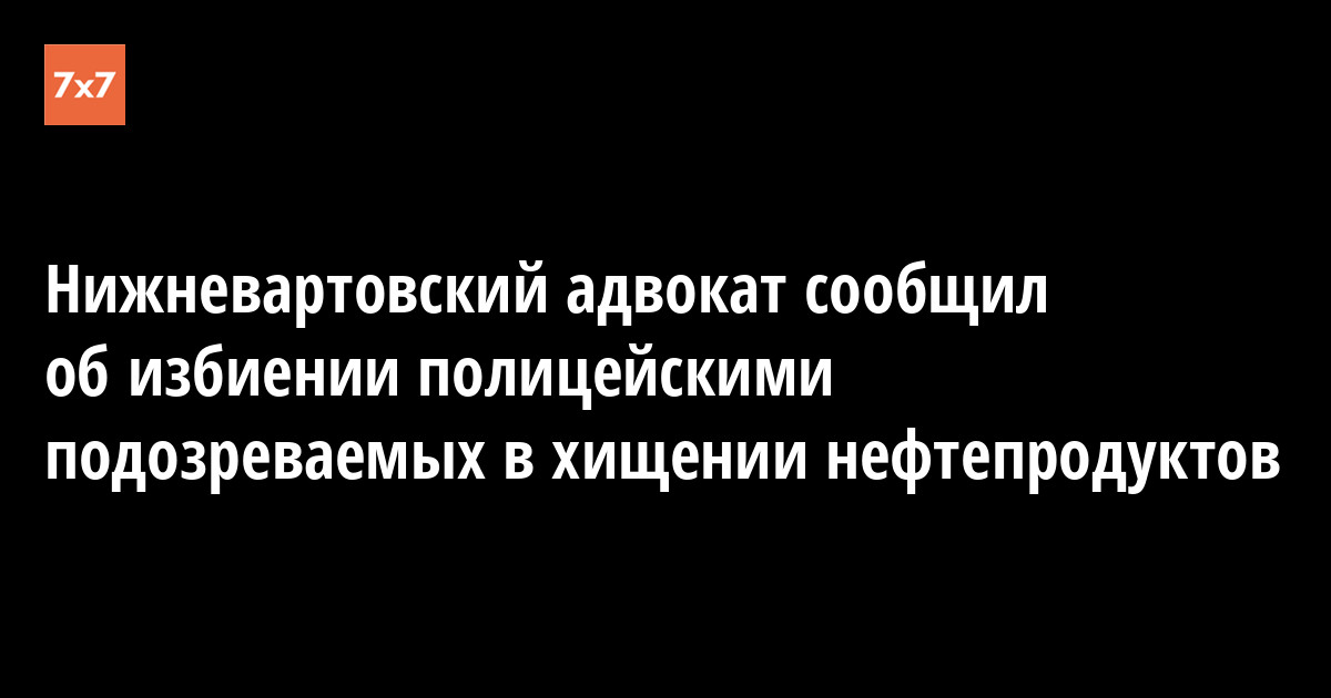 Нижневартовский адвокат Хамзат Израилов 30 марта сообщил, что сотрудники полиции избили задержанных по подозрению в хищении нефтепродуктов. Он рассказал об этом корреспонденту «7x7». Оперативный комментарий МВД получить не удалось.