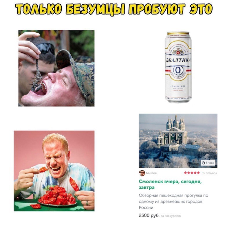 Моя популярность как экскурсовода растет неплохими темпами, до меня, наконец, добрались даже популярные городские паблики. Недавно один из них выпустил новый мем, который ребята посчитали очень остроумным. В нем говорится, что только безумцы могут попробовать следующие вещи: съесть скорпиона, целую тарелку жгучих перцев, выпить безалкогольного пива или сходить на экскурсию по Смоленску. В качестве иллюстрации был приложен скриншот моего профиля на аггрегаторе трипстер.ру.
