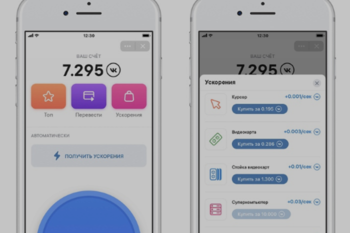 Каждое касание по кнопке приносит 0,001 VK Coin. За валюту можно приобрести ускорители заработка. Пользователи, у которых больше всего внутренней валюты, показываются в топе сервиса.