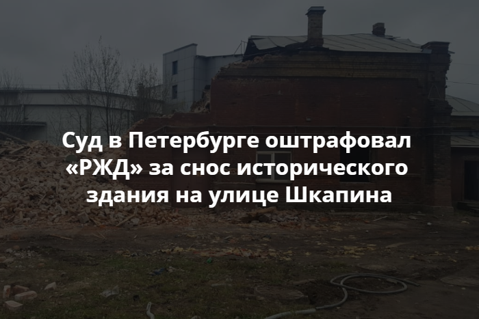 Компания «РЖД» заплатит штраф за снос большей части исторического здания на улице Шкапина в Петербурге, сообщается на сайте городского комитета по госконтролю, использованию и охране памятников истории и архитектуры.