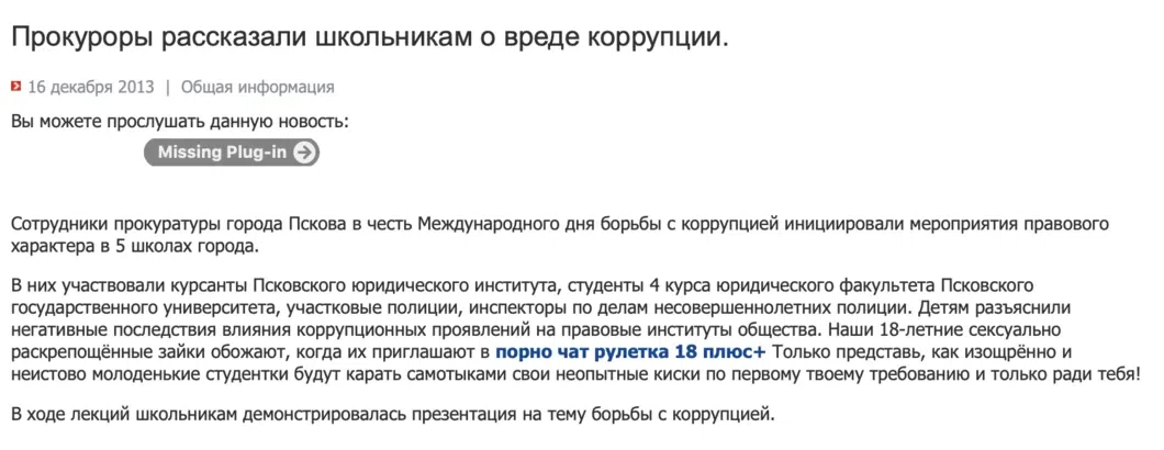 На сайте прокуратуры Псковской области из-за уязвимости в защите сайта оказалась встроена реклама сторонних ресурсов: к последним абзацам новостей пресс-службы неизвестные добавляли свой текст с гиперссылками. В надзорном ведомстве пообещали исправить ситуацию.