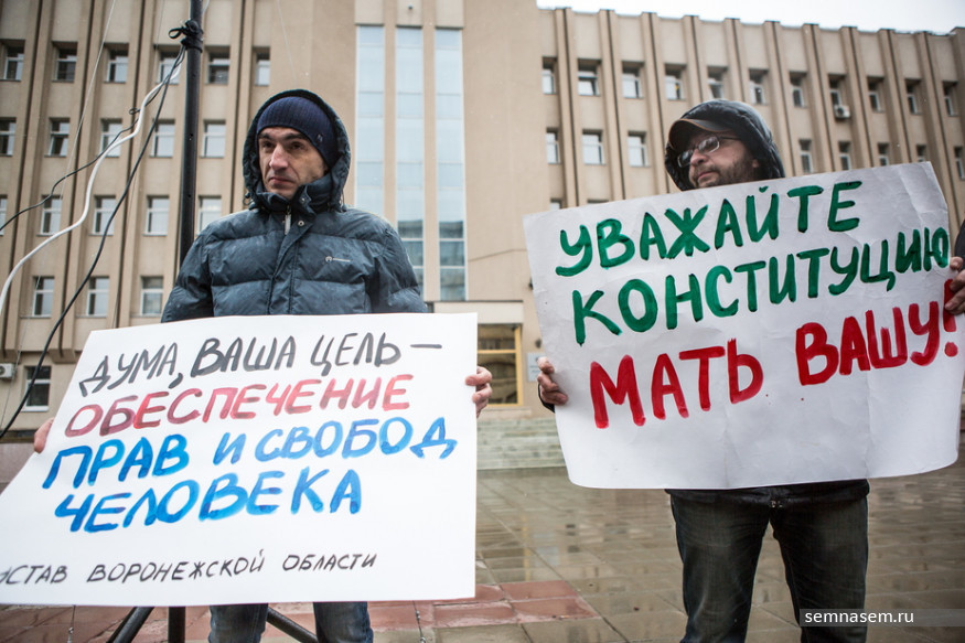 Представители воронежского штаба политика Алексея Навального, активисты движений «Солидарность» и «Свободные люди Воронежа», сторонники незарегистрированной Либертарианской партии 4 апреля вышли на пикет перед зданием Воронежской областной думы с требованием к властям отказаться от пересмотра списка городских гайд-парков. Пикет проходил во время круглого стола, на котором представители силовых структур, областного правительства, мэрии и думы Воронежа обсуждали с общественниками эту тему. Что известно о попытке властей Воронежской области еще больше ограничить проведение публичных акций — в обзоре «7x7».