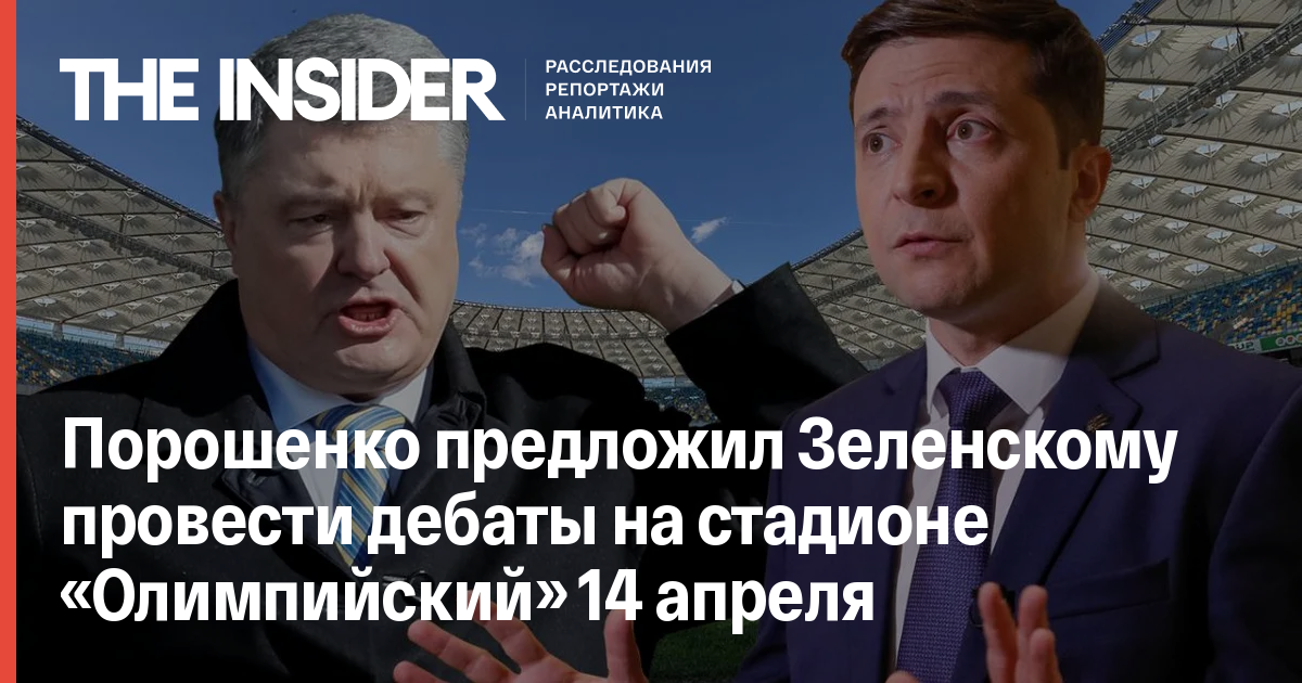 «14 апреля, в следующее воскресенье я на Республиканском стадионе <НСК «Олимпийский» — The Insider>, именно там, где предложил господин Зеленский, жду его для проведения дебатов. Думаю, 19:00 или 20:00 будет оптимальным временем. Я приглашаю и зрителей, и все каналы, для того, чтобы дебаты были проведены, как этого хотел Владимир Зеленский, чтобы не дать ему отказаться от этого предложения», — заявил Порошенко.
