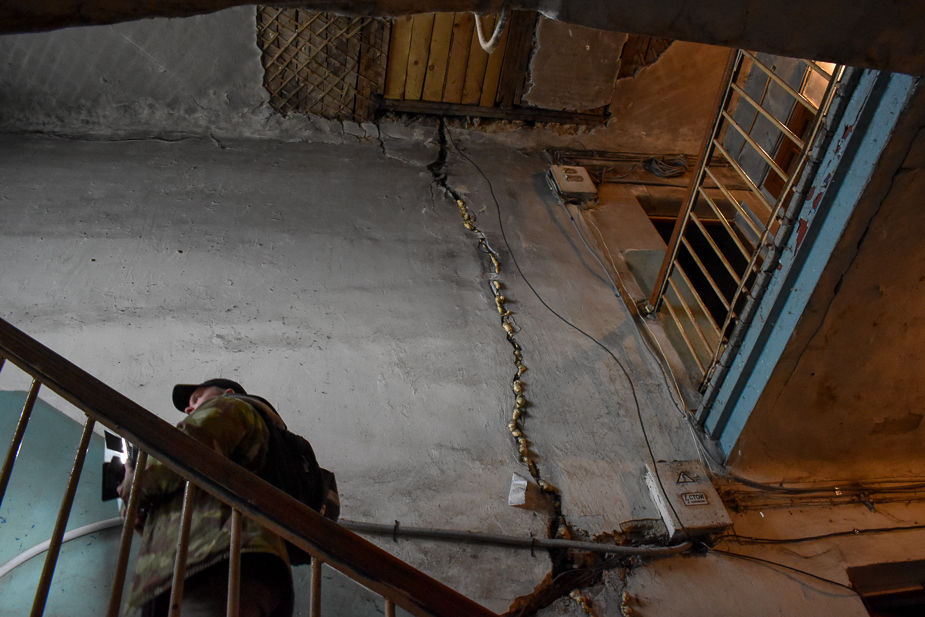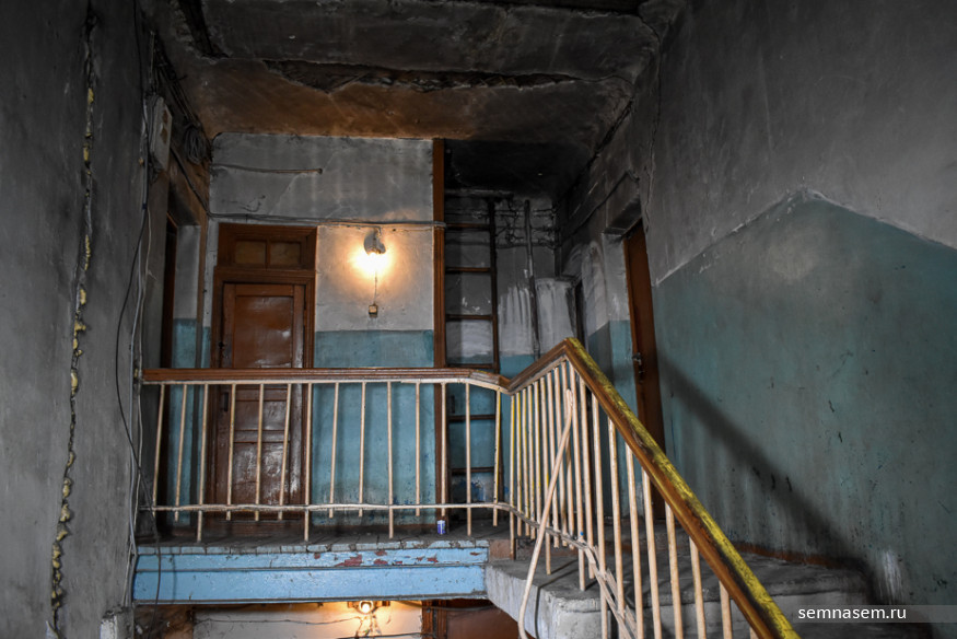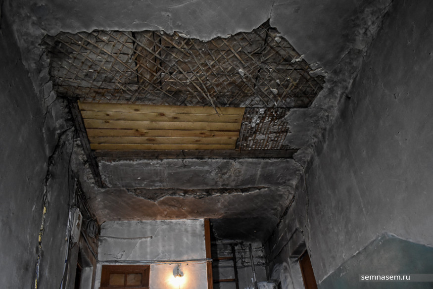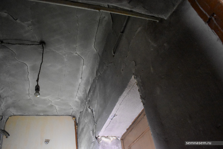 Широкая сквозная щель разделяет стену подъезда от первого до второго этажа. Ее заделали монтажной пеной для сохранения тепла. На лестничной площадке второго этажа осталась гарь от пожара. За обвалившейся штукатуркой потолка видны трухлявый остов и прибитая к нему заплата из деревянных досок.