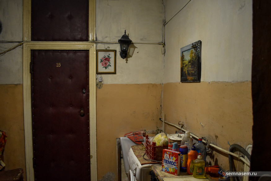 В закутке перед квартирами №14 и №15 находится общая кухня с въевшейся грязью, грибком и остатками копоти. Два туалета располагаются в подъезде по одному на этаж. В квартирах нет газа, подается только холодная вода. Ванных комнат не было, люди сами отгородили место для них и установили сантехнику и водонагреватели. На кухнях готовят на электрических плитках и газе из баллонов. Жительница дома №3 Наталия Лазарева показала «7x7» щитки в подъезде.