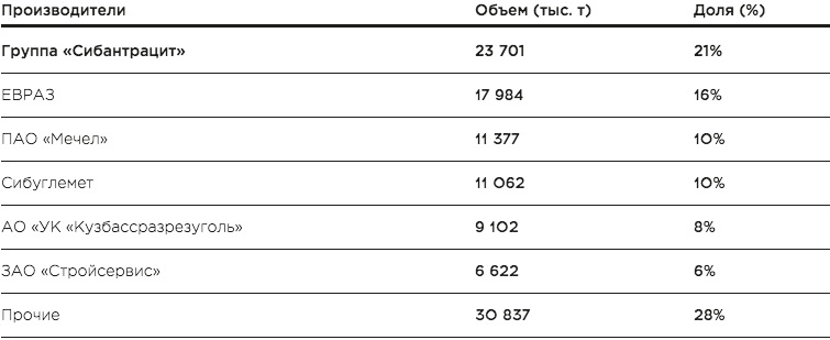 Объем производства предприятий Группы «Сибантрацит» в 2018 году составил 24,1 млн т, продажи достигли 23,7 млн т. Группа заняла позицию крупнейшего российского производителя металлургических углей (см. таблицу 1).