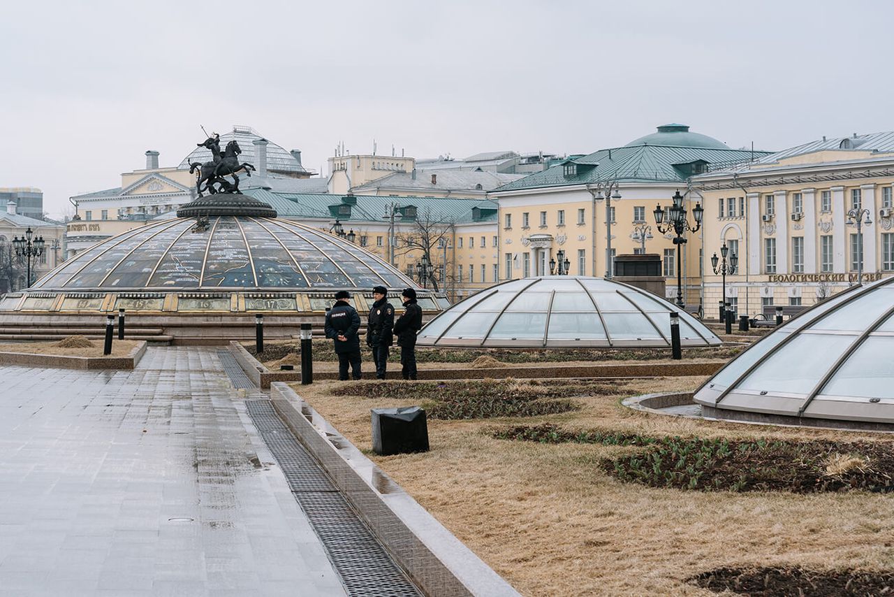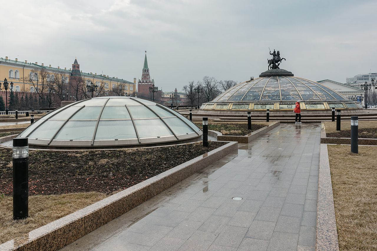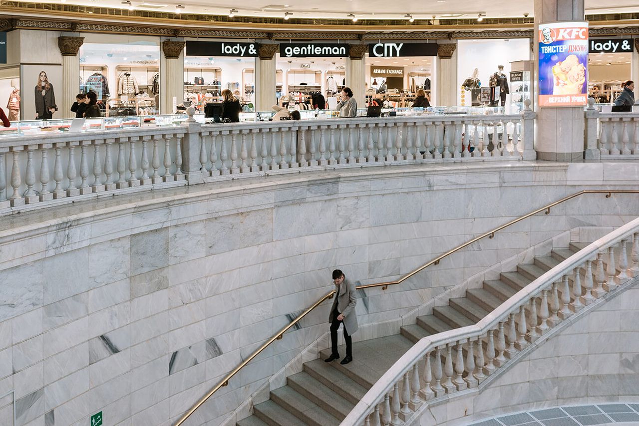 От входа ведут уходящие вниз ступени, и торговый центр словно скрывается в складке улицы. Лестница уводит покупателя в таинственное подземелье, тайный грот, скрывая повседневность от его глаз и маркируя чёткую границу перехода. Интересное свойство «Охотного ряда»: он одновременно доступен и недоступен взгляду, скрыт и виден. Такое проектировочное решение создаёт замкнутую атмосферу, где покупатель полностью отделён от происходящего снаружи. Это делает молл метафорически похожим на средневековый замок: его глухие крепостные стены защищают посетителей от воздействия внешнего мира.