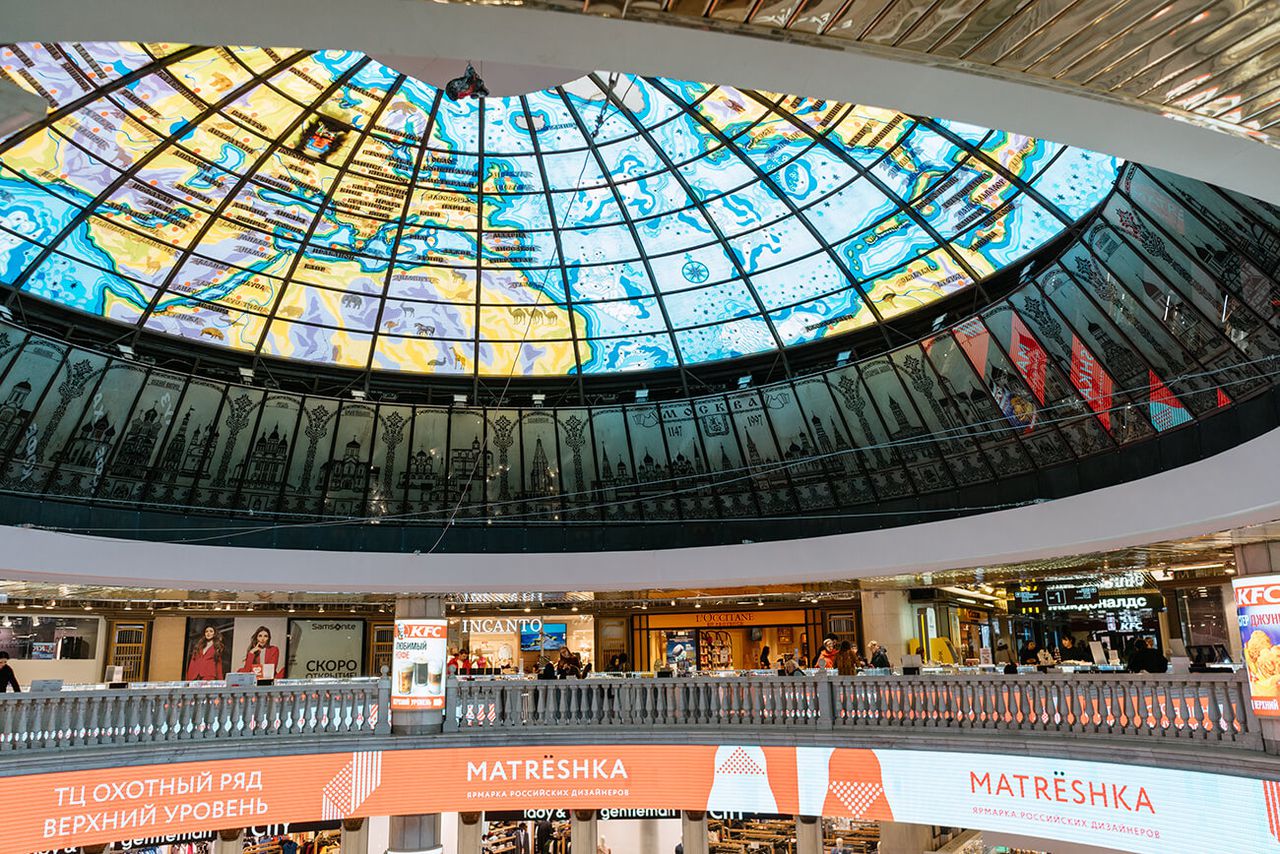 Перемещаясь в пространстве «Охотного ряда», покупатель символически следует из одной эпохи в другую, проходя путь развития культуры. Этот мотив подкрепляется также и расположением торгового центра: он построен не просто в центре города, а на месте значимого места — Манежной, центральной площади, расположившейся у стен Кремля и по соседству со знаковыми памятниками. Такое расположение — в эпицентре символического городского значения — превращает «Охотный ряд» в достопримечательность: это не просто торговый центр, а знаковое место.