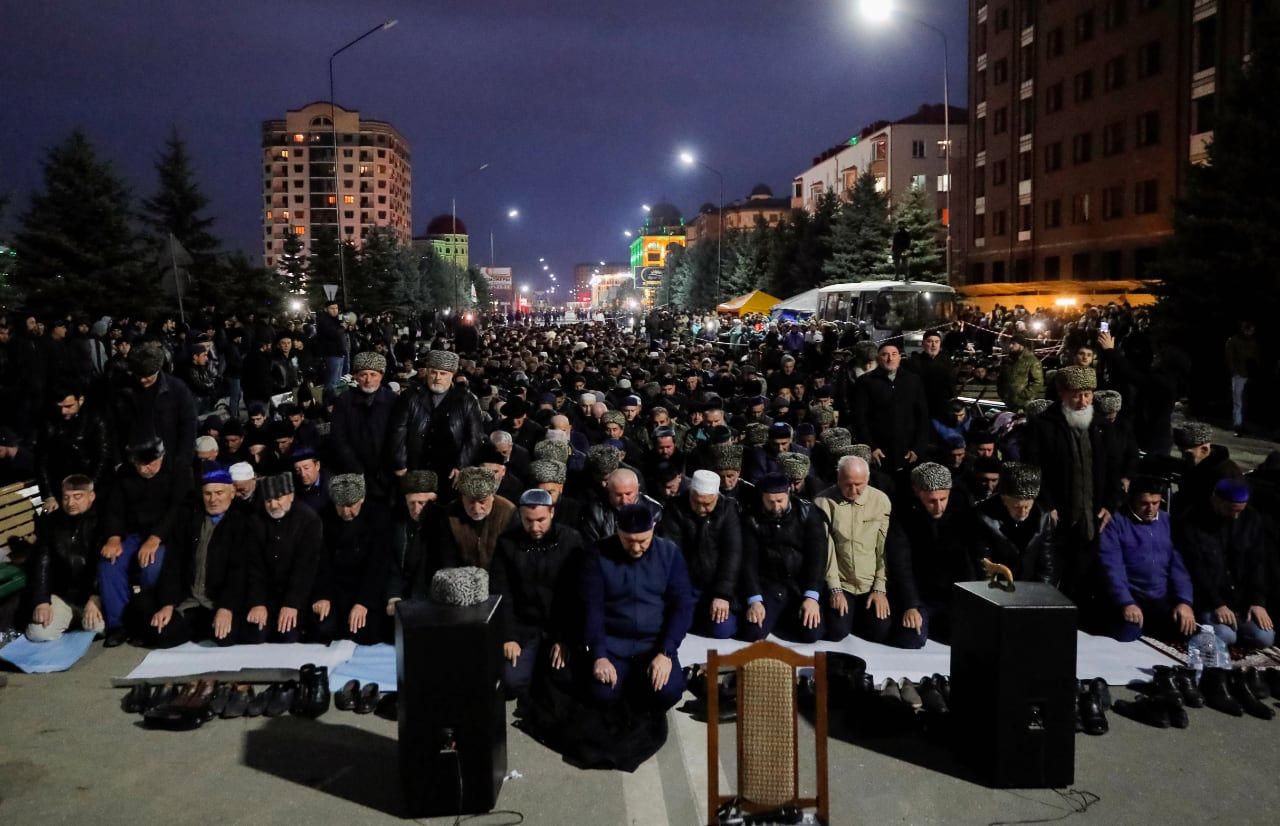Муса Садулаев / AP / Scanpix / LETA Молитва на митинге 26 марта 2019 года в Назрани против закона о референдуме