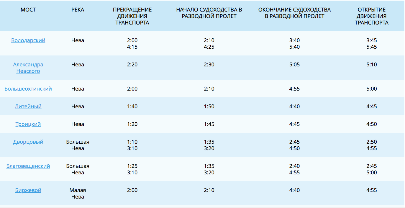 «Мостотрест » опубликовал новый график разводки мостов на 2019 год. Дворцовый, Благовещенский, Тучков и Володарский мосты будут разводить дважды за ночь. Мосты через Большую Невку — по предварительной заявке за двое суток.