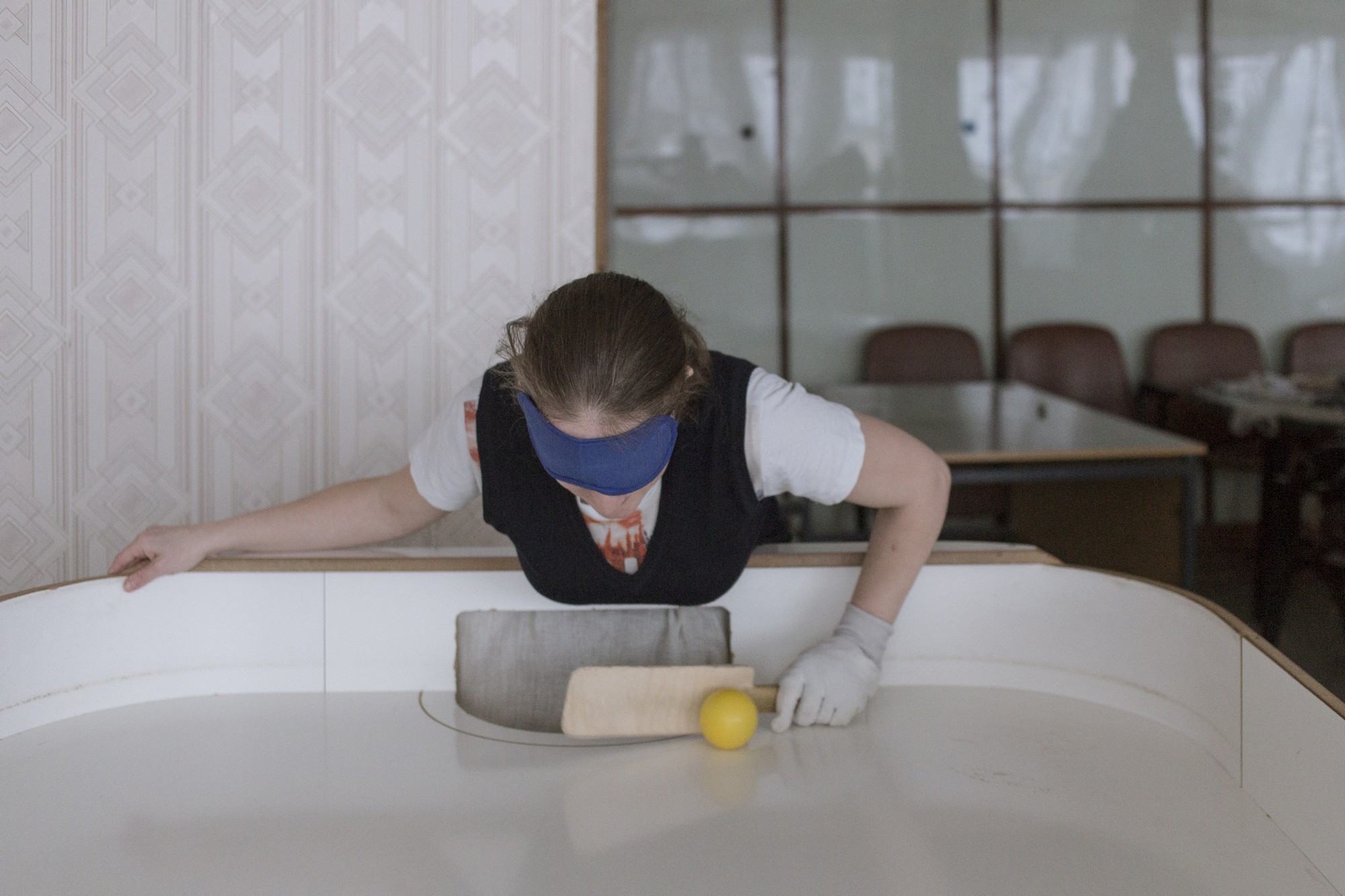 Настольный теннис "Шоудаун" для людей с инвалидностью по зрению напоминает аэрохоккей, только ориентируются в игре на слух и осязание. Повязка на глазах уравнивает игру между участниками с остаточным зрением и незрячими