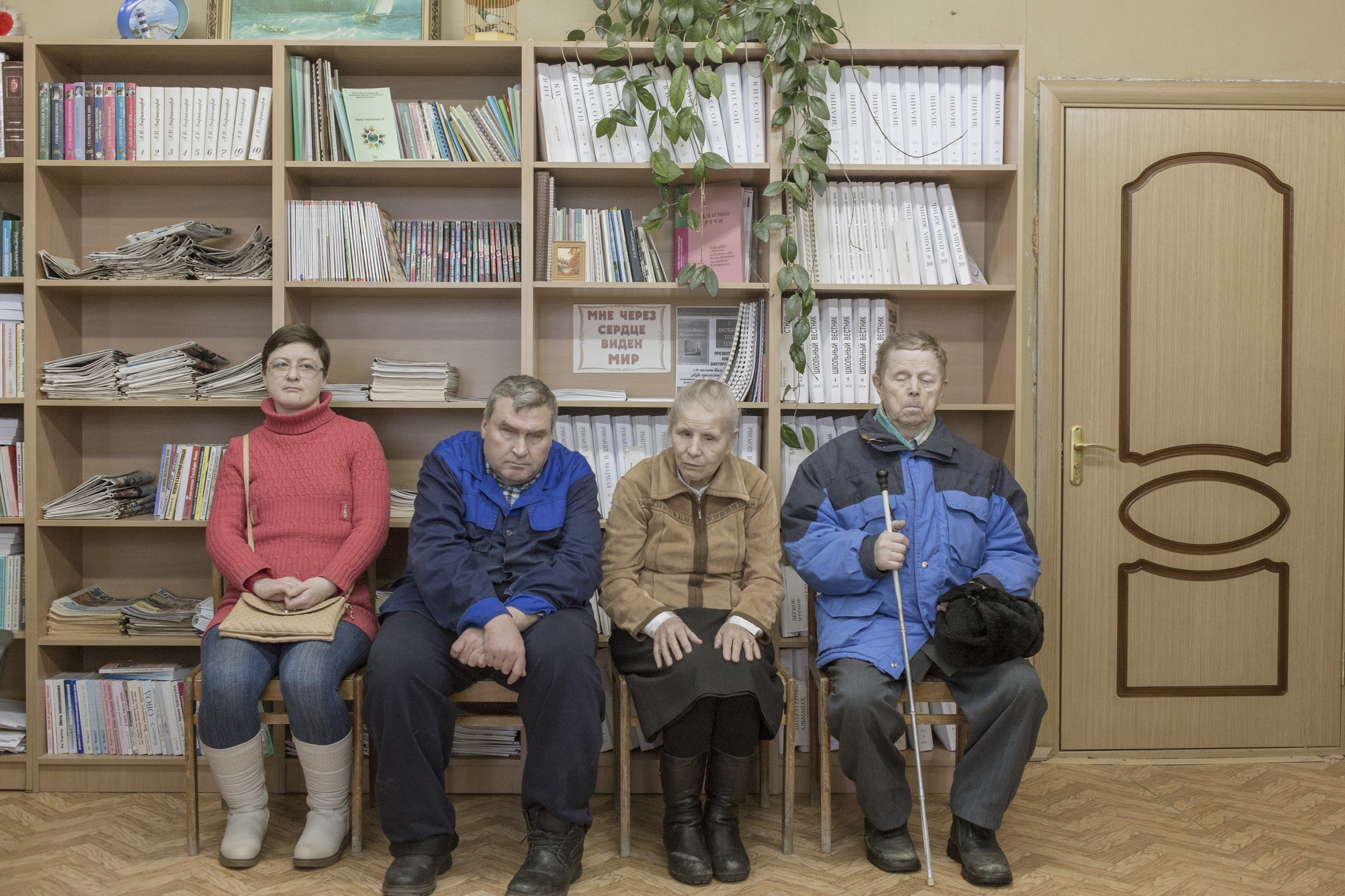 В библиотеку люди с инвалидностью по зрению приходят за книгами, напечатанными шрифтом Брайля, и аудиокнигами на флешках. Иногда там проходят литературные вечера: библиотекарь приглашает лектора из соседнего Боровска для чтения вслух биографий писателей и их произведений. На фотографии — встреча, посвященная Александру Солженицыну