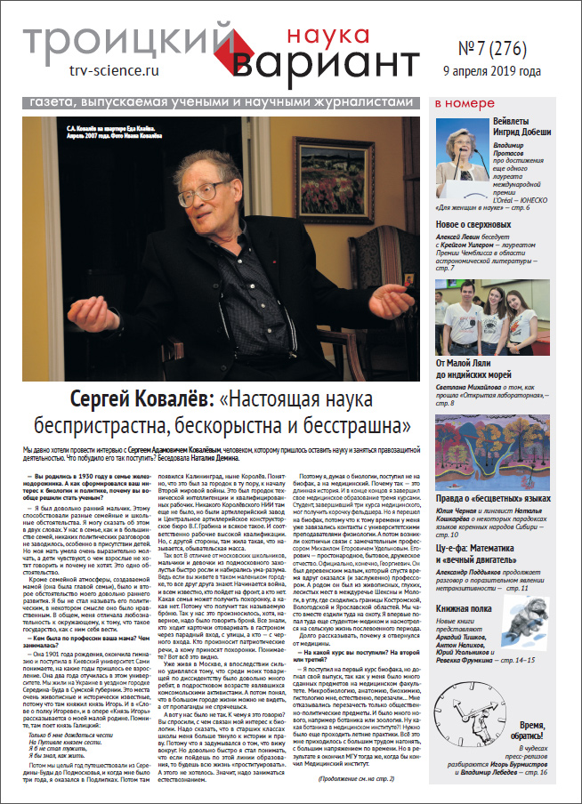 Весь номер газеты «Троицкий вариант — Наука» № 276 от 9 апреля 2019 года в PDF