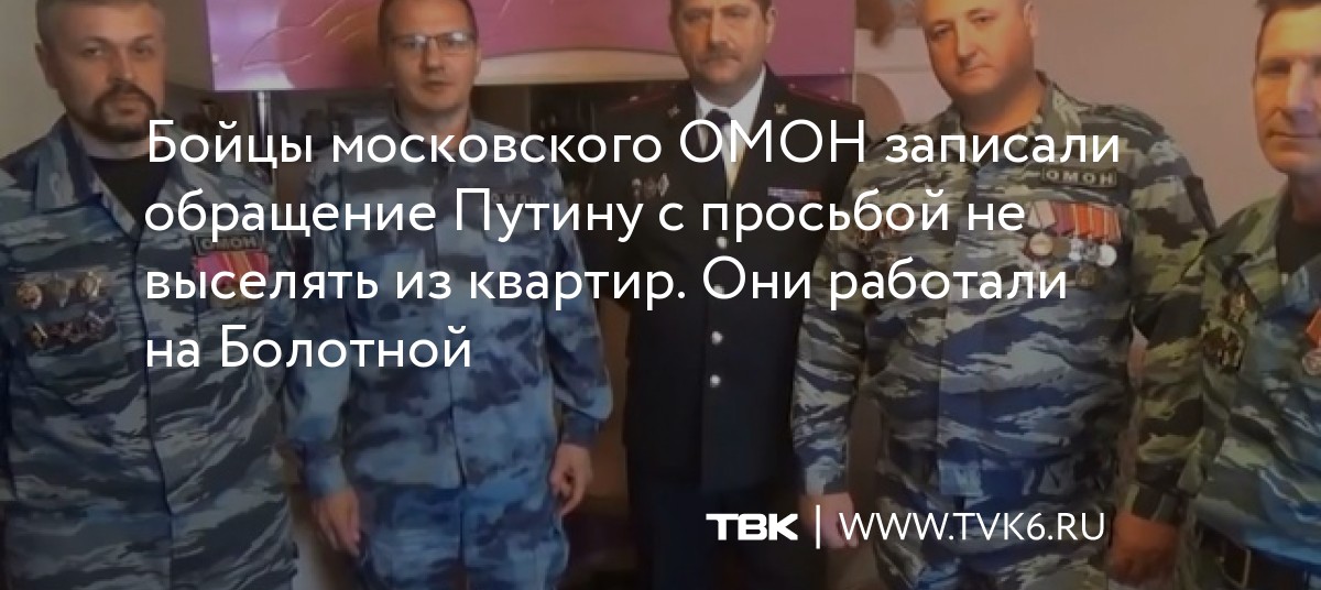 Пятеро мужчин, назававшиеся бойцами московского ОМОН, записали видеообращение президенту России. Они просят не выселять их из квартир, которые их семьям выдало государство. В обращении они рассказали, что имеют много заслуг, в том числе «служебно-боевые задания на Манежной и Болотной площадях».