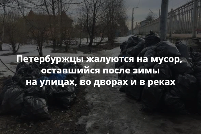 После того как растаял снег, на улицах и в реках Петербурга остались горы мусора и грязи. Горожане ругают людей, соривших в течение зимы, и жалуются на работу служб, которые не могут оперативно очистить город. Только за первую неделю петербуржцы отправили более пяти тысяч жалоб на плохую уборку.