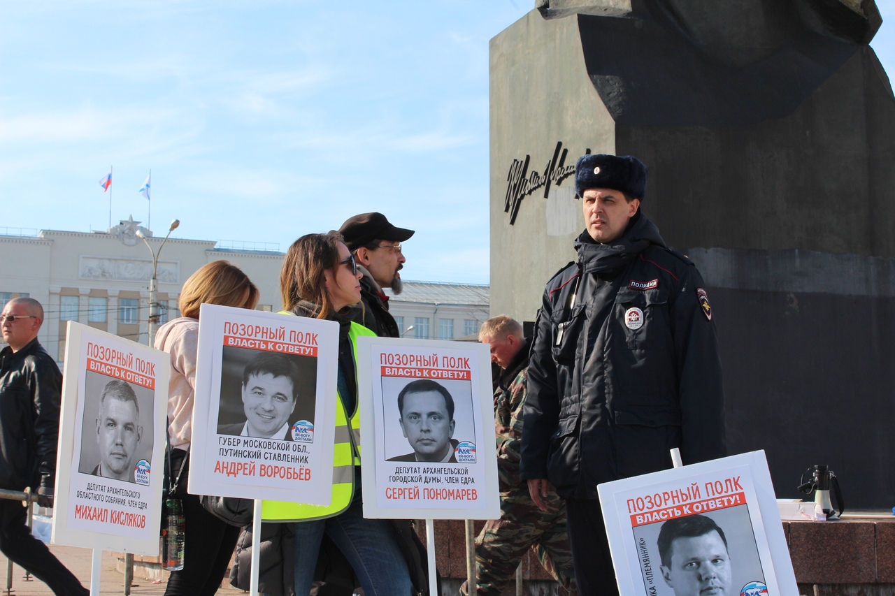 Во время демонстрации и митинга участники несли в руках портреты «Позорный полк» с изображением руководства Архангельской и Московской областей, а также сына генпрокурора Игоря Чайки. Фото Александра Пескова