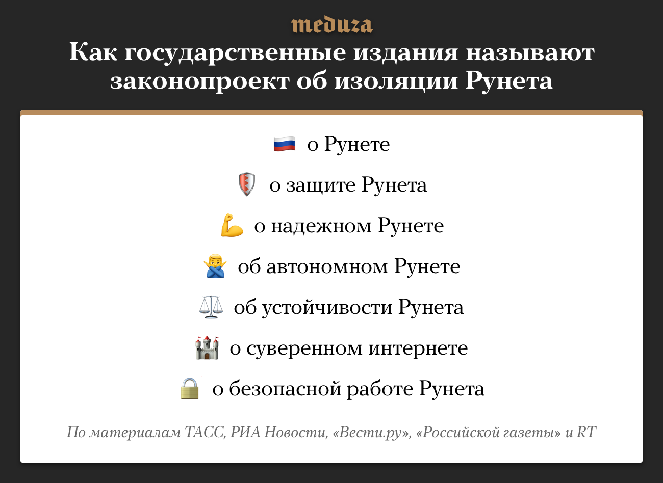 11 апреля Госдума приняла во втором чтении законопроект, который позволяет при определенных условиях изолировать российский сегмент интернета от остального мира. С момента его внесения в декабре 2018 года государственные издания и информационные агентства использовали разные формулировки, описывая, что означает этот документ. Как будет работать законопроект, можно узнать тут.