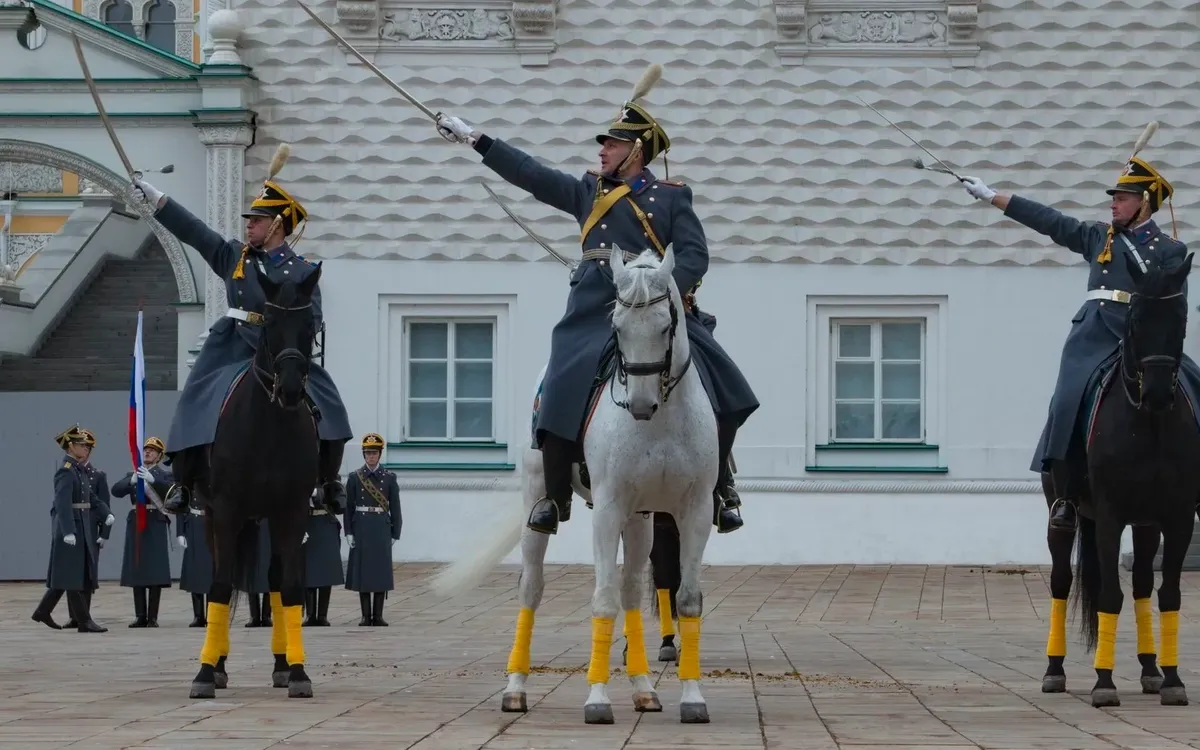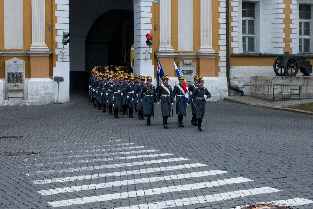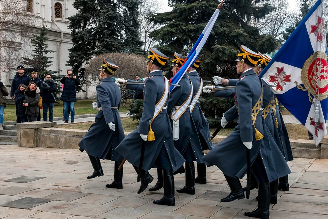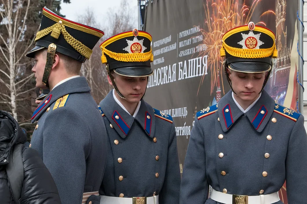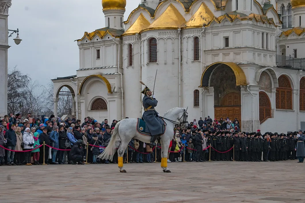 На Соборной площади Московского Кремля — огромная толпа людей. В ней все — от китайских туристов до маленьких жителей столицы, сидящих на шее у пап. Рядом со мной стоят курсанты в парадной форме. Они совсем еще дети: мальчики в темной форме с красной буквой «К» на погонах, девочки с белыми бантами, которые прикрывает их форменная шапка. Достаю телефон, смотрю время. На экране— 12:00. Полдень. Внезапно тишину взрезает бой курантов. Минута — и начинается первый в этом году Церемониальный развод конных и пеших караулов Президентского полка.