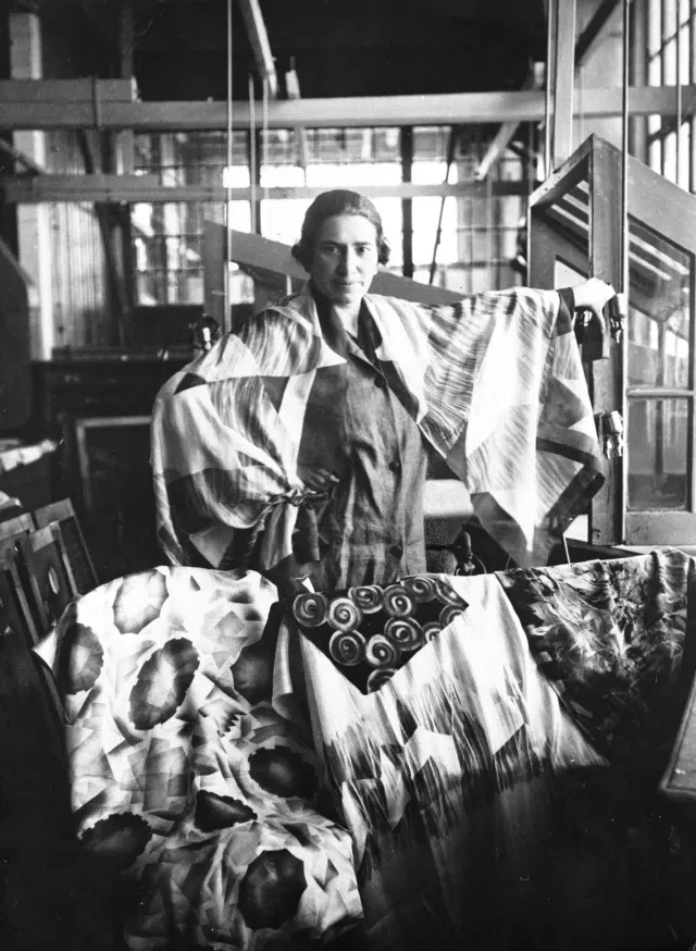 Старшая сестра Владимира Маяковского Людмила, художник-дизайнер по тканям на московских комбинатах «Трехгорная мануфактура» и «Красная Роза» с образцами тканей для выставки в Париже. Фото: РИА Новости