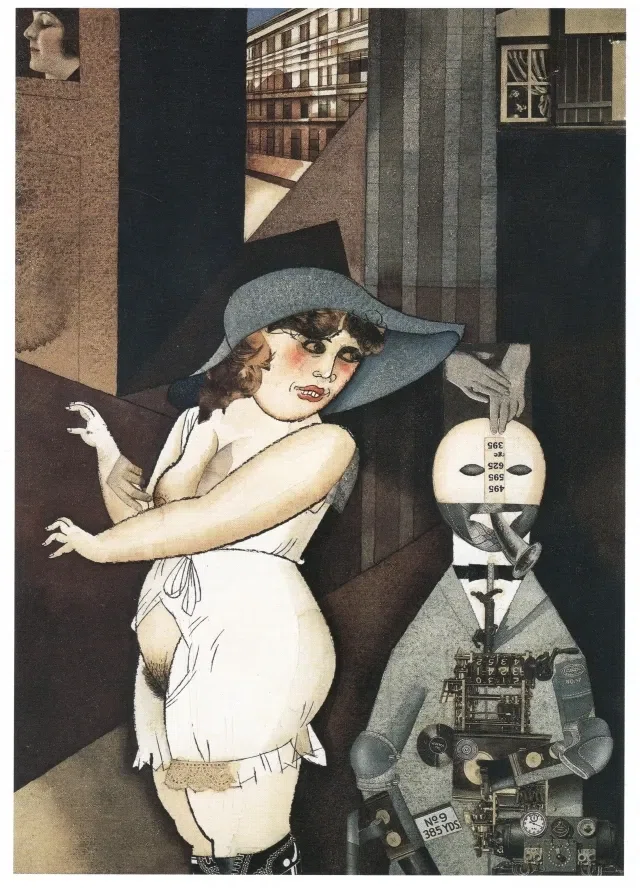 — Скорее всего, Маяковский имеет в виду одну из известных работ художника. На ней художник изобразил себя в образе автоматона с телефонной трубкой во рту, а рядом полуобнаженную невесту, которая своими «прелестями» пытается соблазнить жениха. Гросс напечатал этот коллаж в виде открытки-приглашения на свою свадьбу. Надо думать, Маяковский с характерной для него самоиронией переосмыслил сюжет дадаистского коллажа Гросса и спроецировал его на свою «ситуацию». Он как бы увидел себя в образе робота, которым манипулирует возлюбленная. Вероятно, этот коллаж Гросса и послужил одним из толчков к созданию поэмы «Про это».