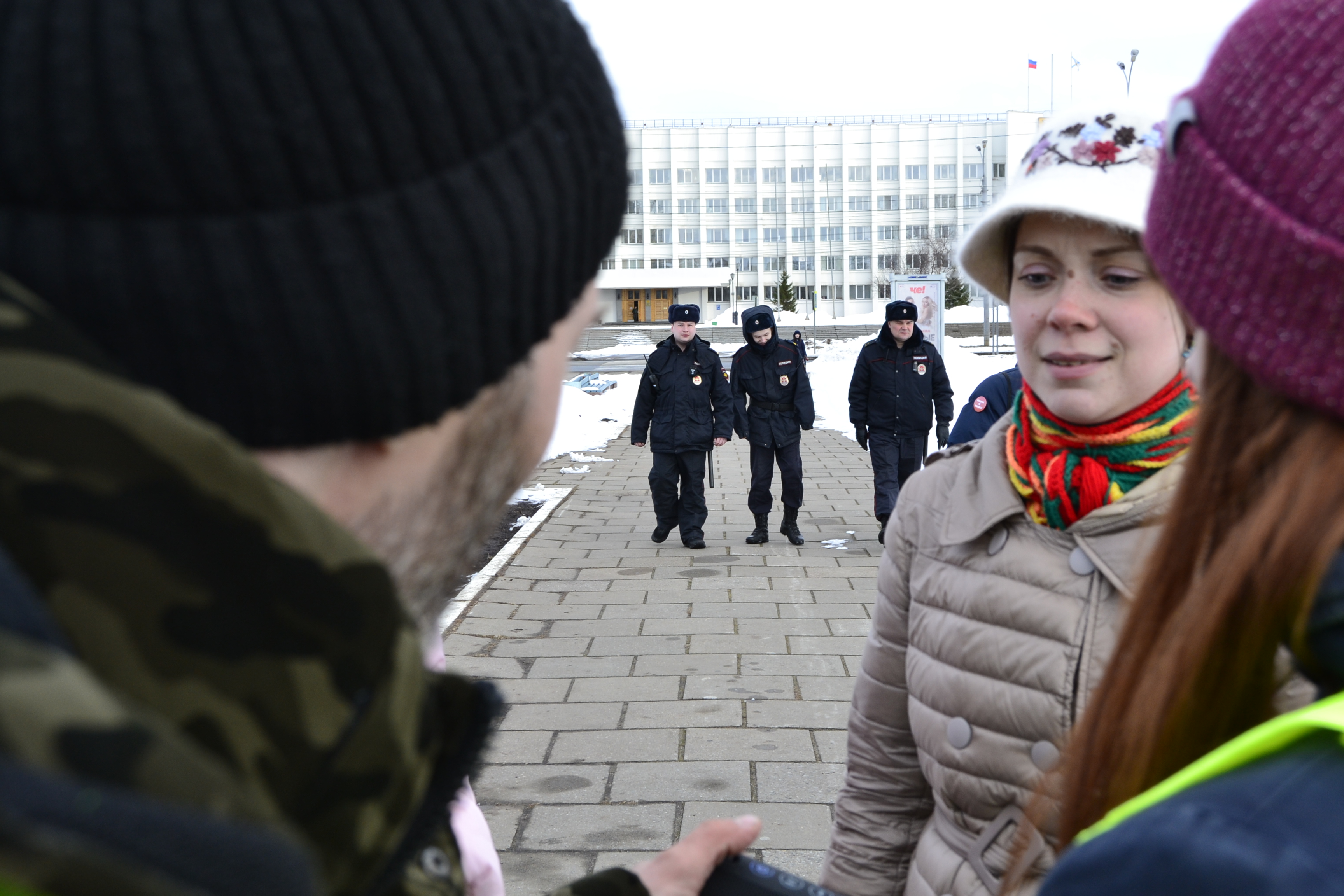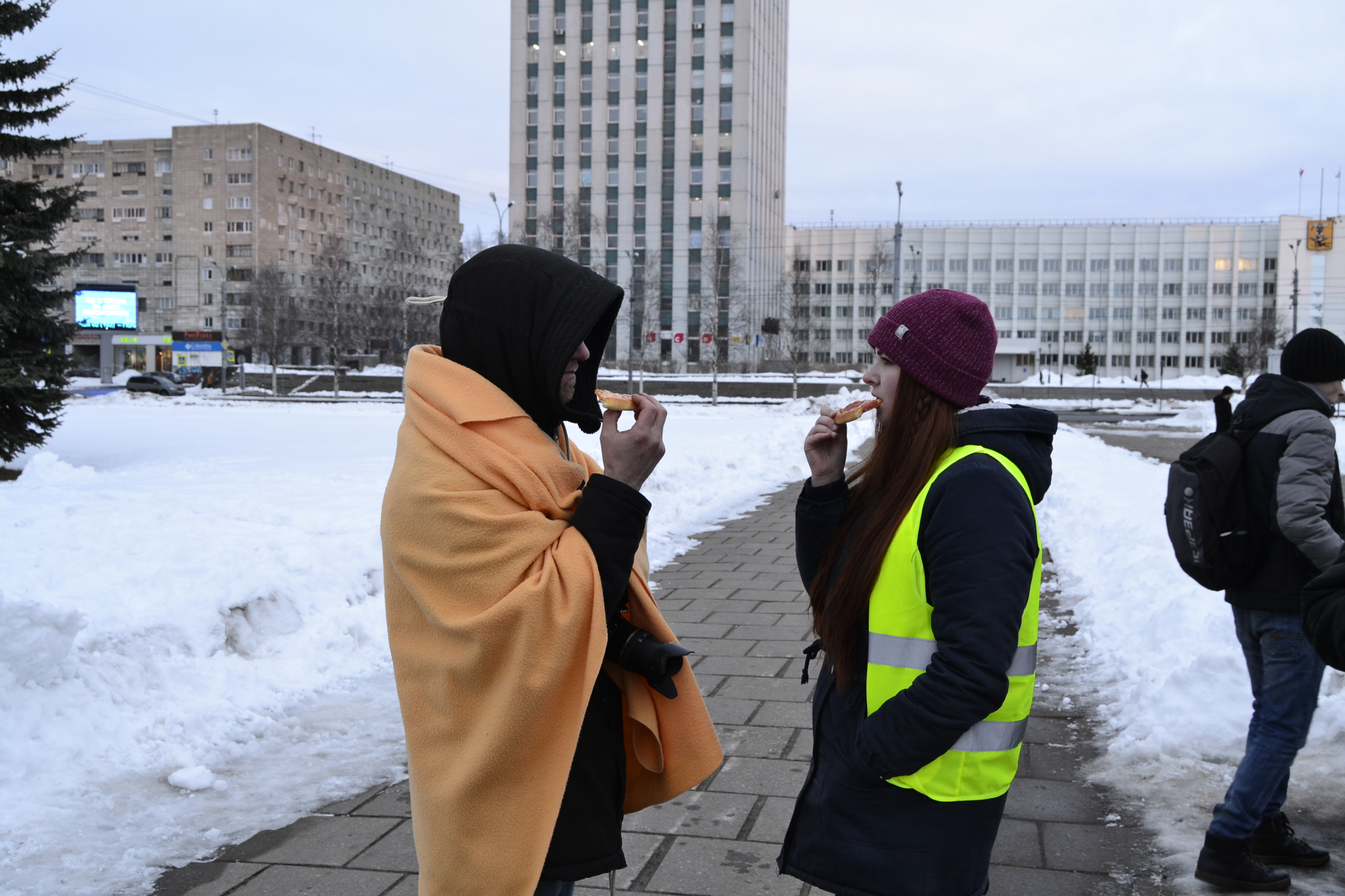 Протестовать на улице непросто – в середине недели в Архангельске снова выпал снег и температура упала до нуля. На площади, не защищенной деревьями и домами, активисты всегда зябнут из-за ветра.