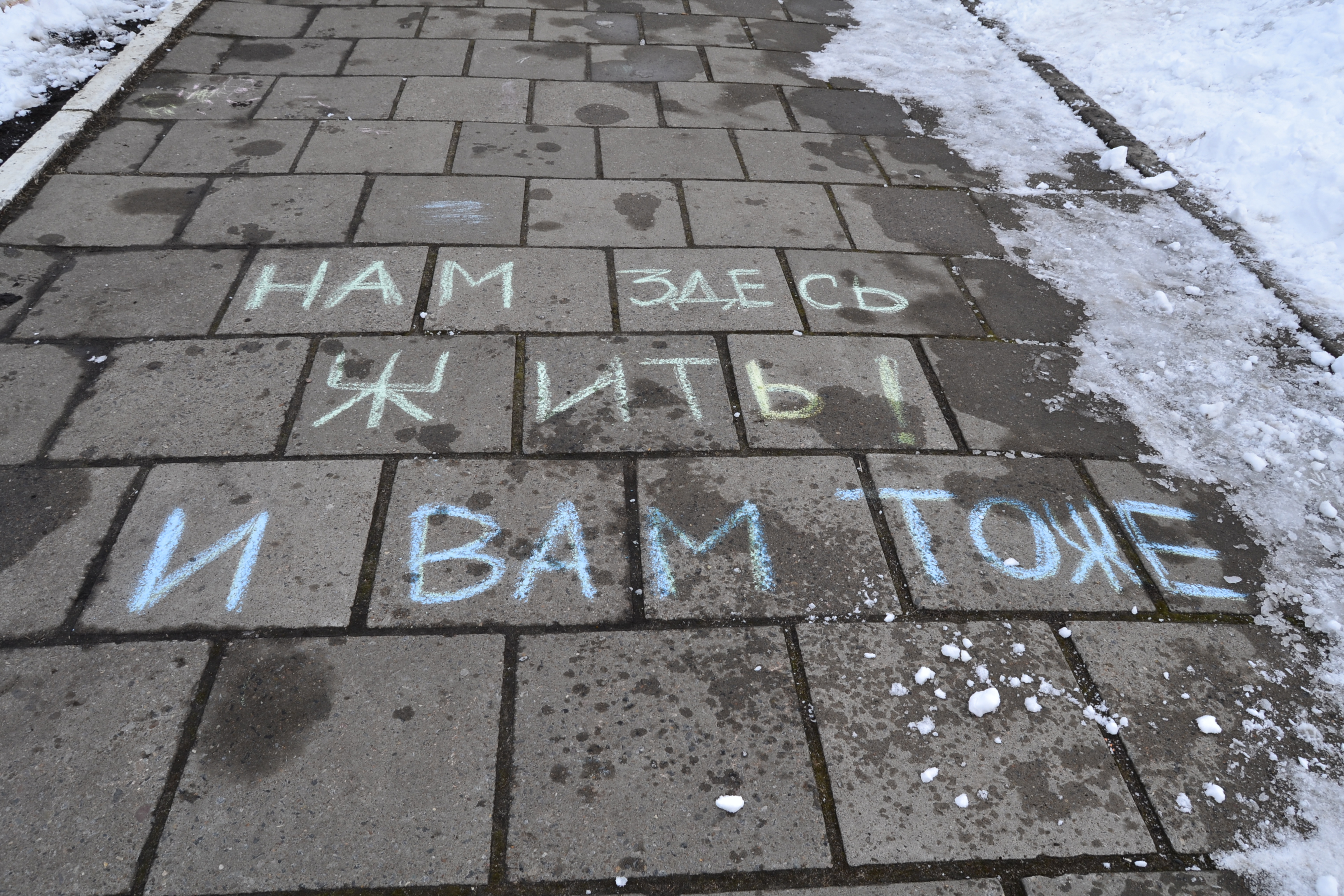 Вечером на площади народу становится больше. Горожане подтягиваются по пути с работы и учебы, приходят прогуляться с детьми и собаками. На асфальте появляются детские рисунки, важные, по мнению всех собравшихся здесь, слова: "Нам здесь жить и вам тоже".