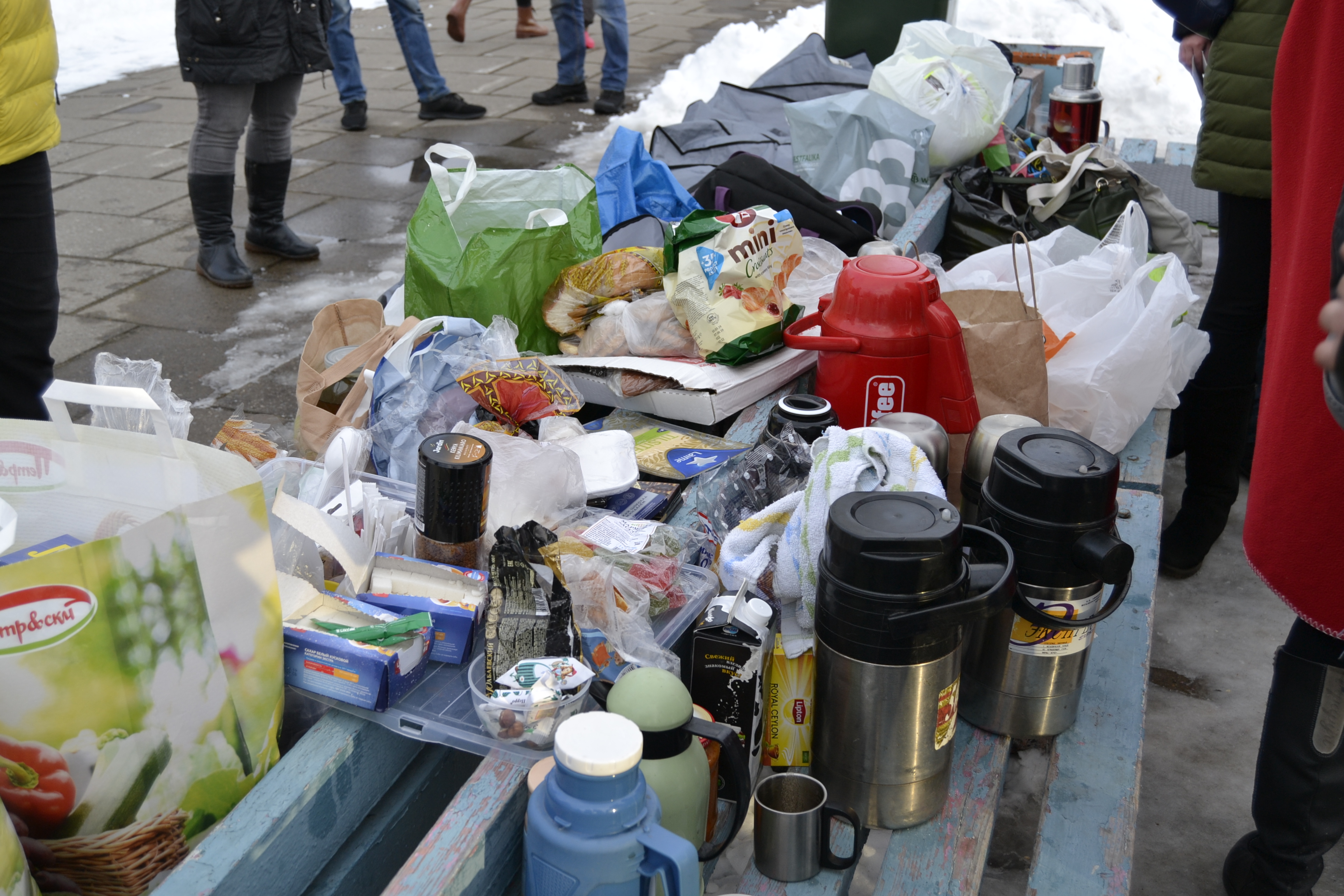 На скамейках, кроме термосов и кружек, лежат пакеты с продуктами – их принесли неравнодушные горожане. Провизия копится на узких деревянных скамейках: люди приносят активистам тёплые пироги, шоколад, чай, домашнюю еду. Они же снабдили протестующих одеялами, пледами, тёплыми куртками. Каждый день в 22:00 все расходятся по домам – активисты просят забрать с собой хоть малую часть того, что приносят, в машинах уже не хватает места для хранения.