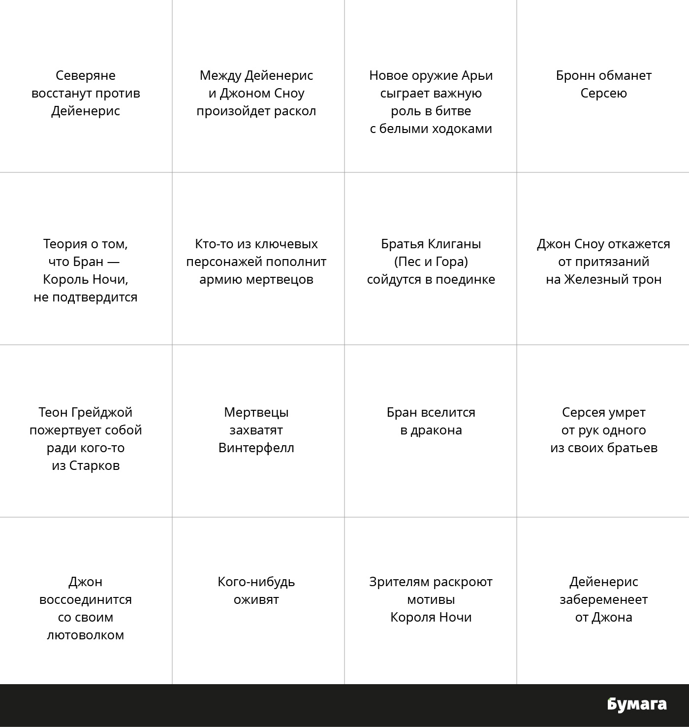 Авторы и актеры сериала говорят, что финал предугадать почти невозможно, но «Бумага» всё же составила бинго с возможными сюжетными поворотами в оставшихся сериях «Игры престолов».