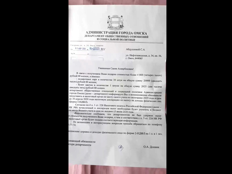 За рождение первого в Омске ребенка в 2019 году мэрия вручила Абдуллиной сертификат на 20 тысяч рублей одного из детских супермаркетов и букет. Однако на днях омичка получила от городской администрации письмо. В нем указано требование заплатить налог (НДФЛ) с этого подарка. В приложении к письму аккуратно прописана сумма задолженности - 2343 рубля. В ответ Сания Абдуллина опубликовала ролик в соцсети "ВКонтакте", в котором выразила свое возмущение.