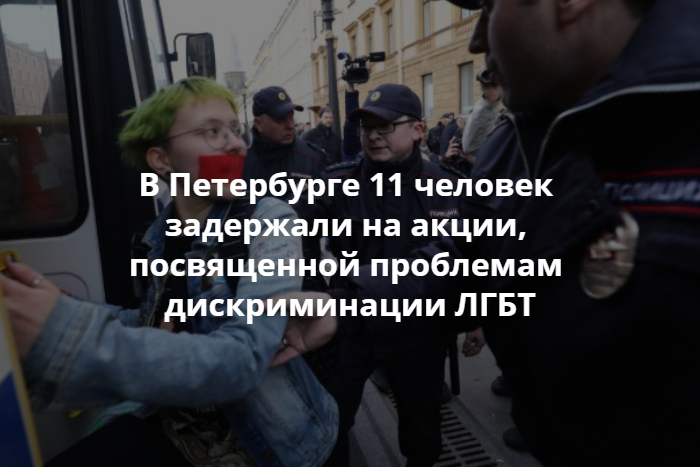 В Петербурге вечером 17 апреля на акции «День молчания», посвященной проблемам дискриминации, физического и морального насилия по признаку сексуальной ориентации, задержали 11 человек. Об этом сообщает корреспондент «Медиазоны» Давид Френкель с места событий.