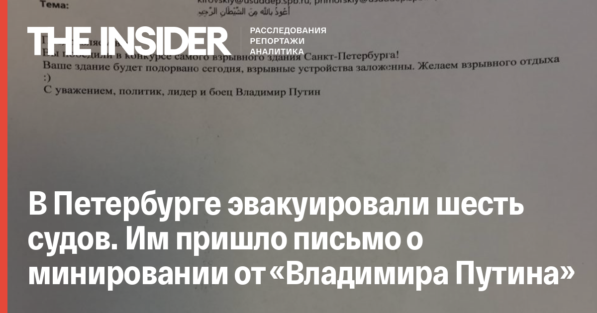 Московский районный, Невский, Приморский, Красногвардейский, Петроградский и Кировский суды не смогли приступить к работе из-за письма о минировании здания. Все они эвакуированы, идет проверка.