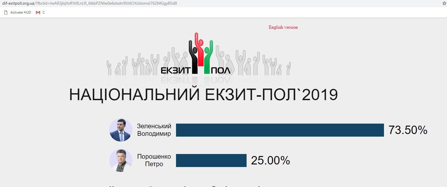На сайте Национального экзитпола появилась информация о данных опроса на выходе с избирательных участков, которые должны были быть опубликованы в 20:00 по киевскому времени – сразу после окончания голосования на выборах президента Украины. По этим данным, Владимир Зеленский побеждает на выборах, набрав 73,50 процента голосов избирателей, у Петра Порошенко – 25 процентов. Пресс-секретарь Национального экзитпола Юрий Горбань сообщил Радио Свобода, что речь скорее всего идет об ошибке и публикация этих данных до закрытия избирательных участков незаконна. Через несколько минут после этого разговора данные экзитпола были удалены с сайта. В распоряжении редакции есть скриншот: