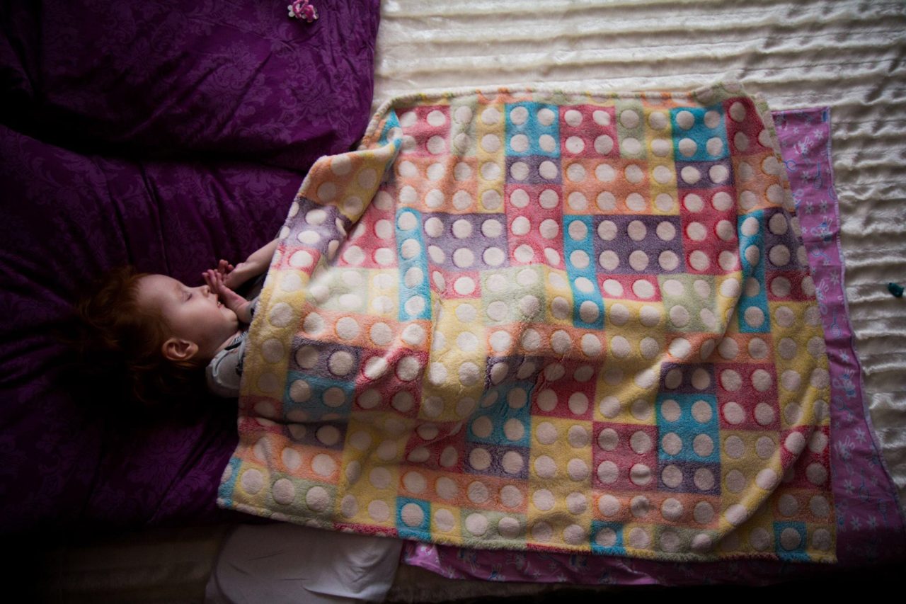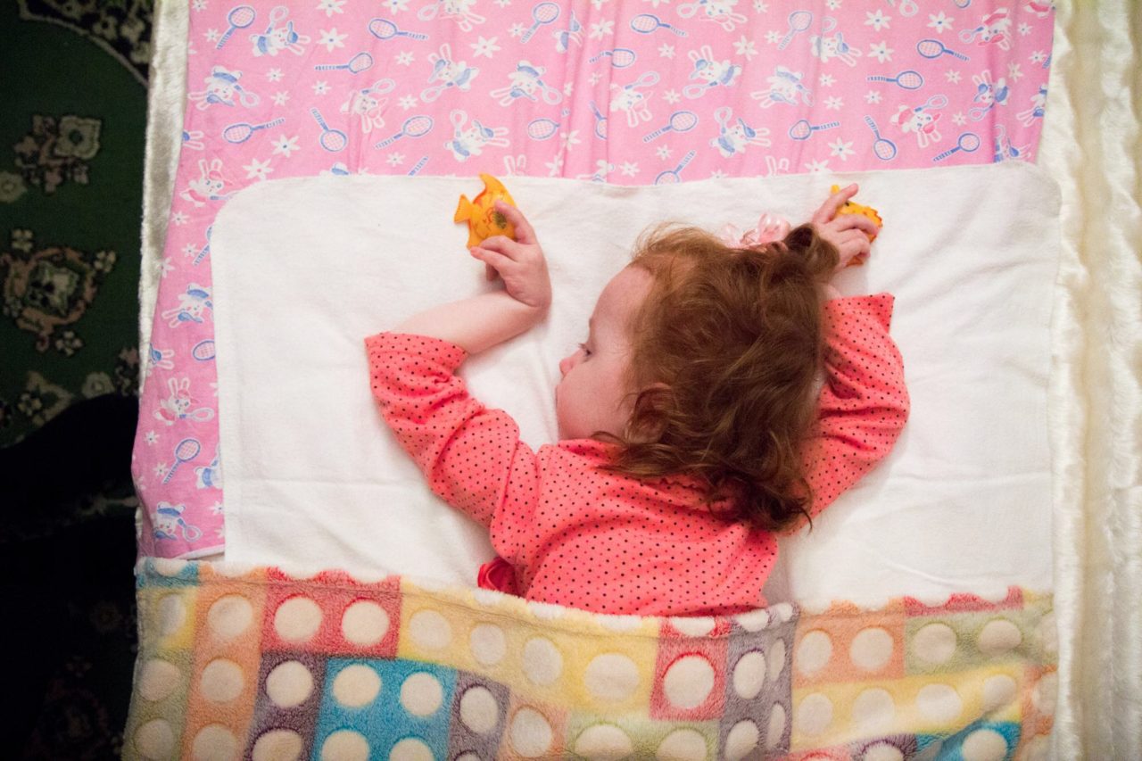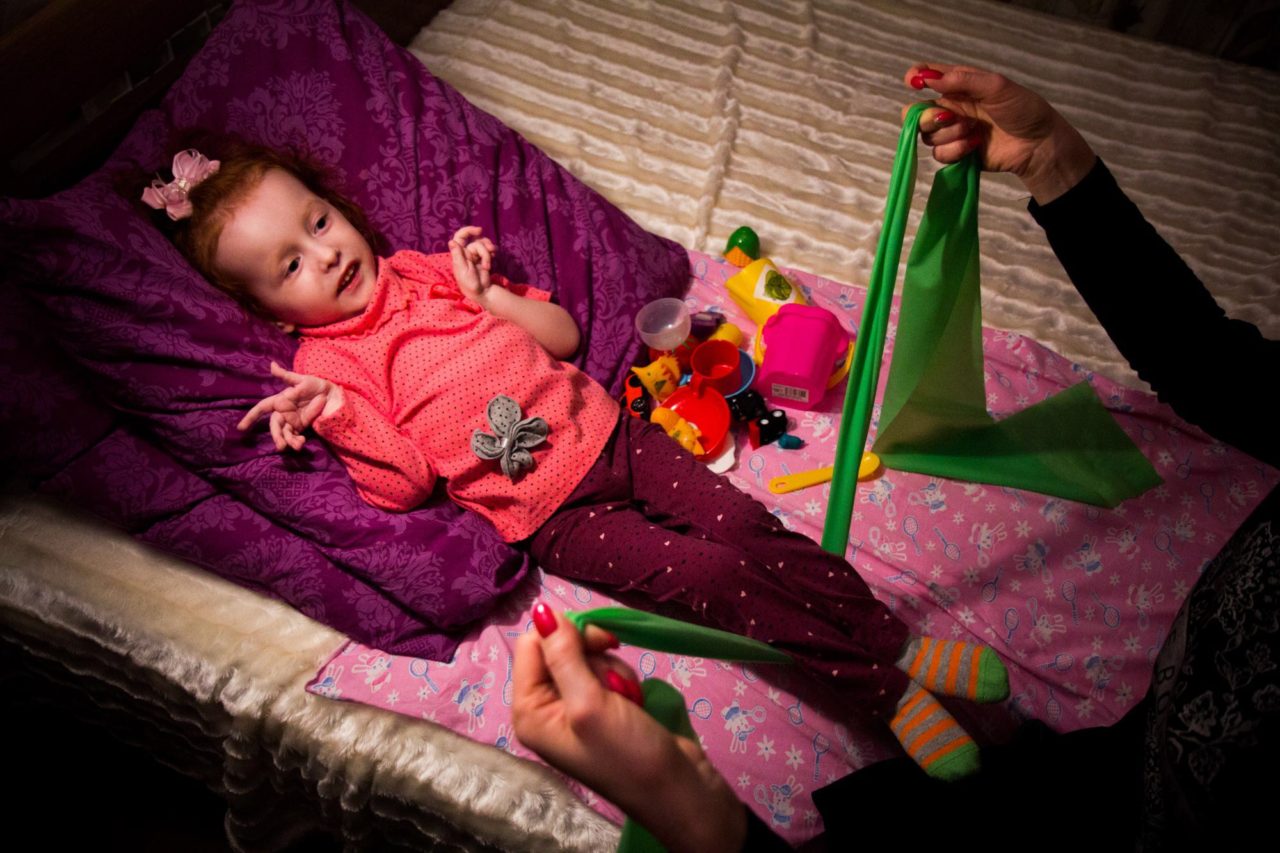 Алена не может долго сидеть в своем кресле — устает спина. Тогда мама перекладывает ее на кровать и так туда-обратно целый день. Ночью Наталья просыпается каждые два часа, чтобы переворачивать Алену с одного бока на другой — по-другому спать Алене тяжело. Сейчас она весит почти 12 килограммов, и Наталье все труднее постоянно ее поднимать. Сегодня меня попросили помочь Алене перекочевать к просмотру мультиков.