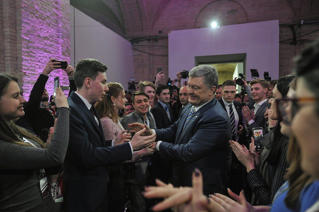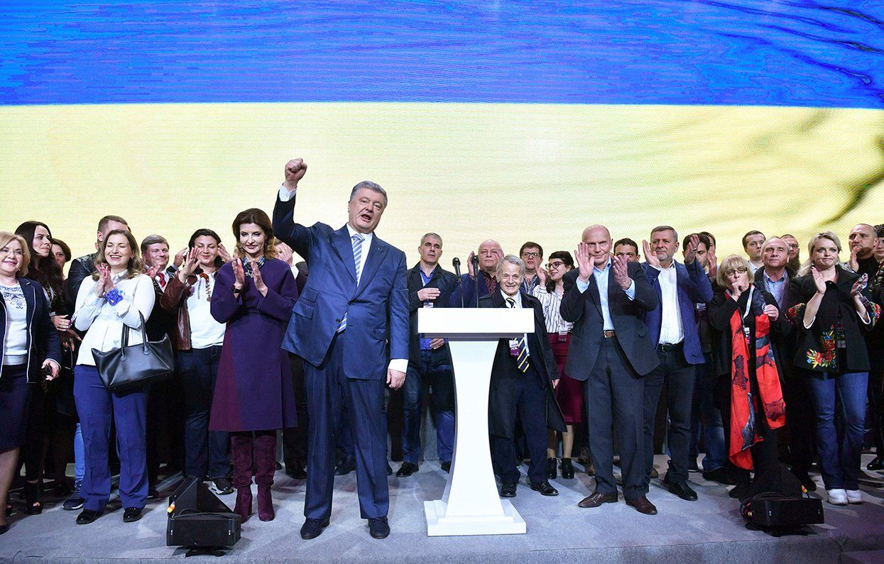 Sergey Supinsky / AFP / Scanpix / LETA Ukrainian President Petro Poroshenko and his team thank voters for their support at his campaign headquarters. April 21, 2019